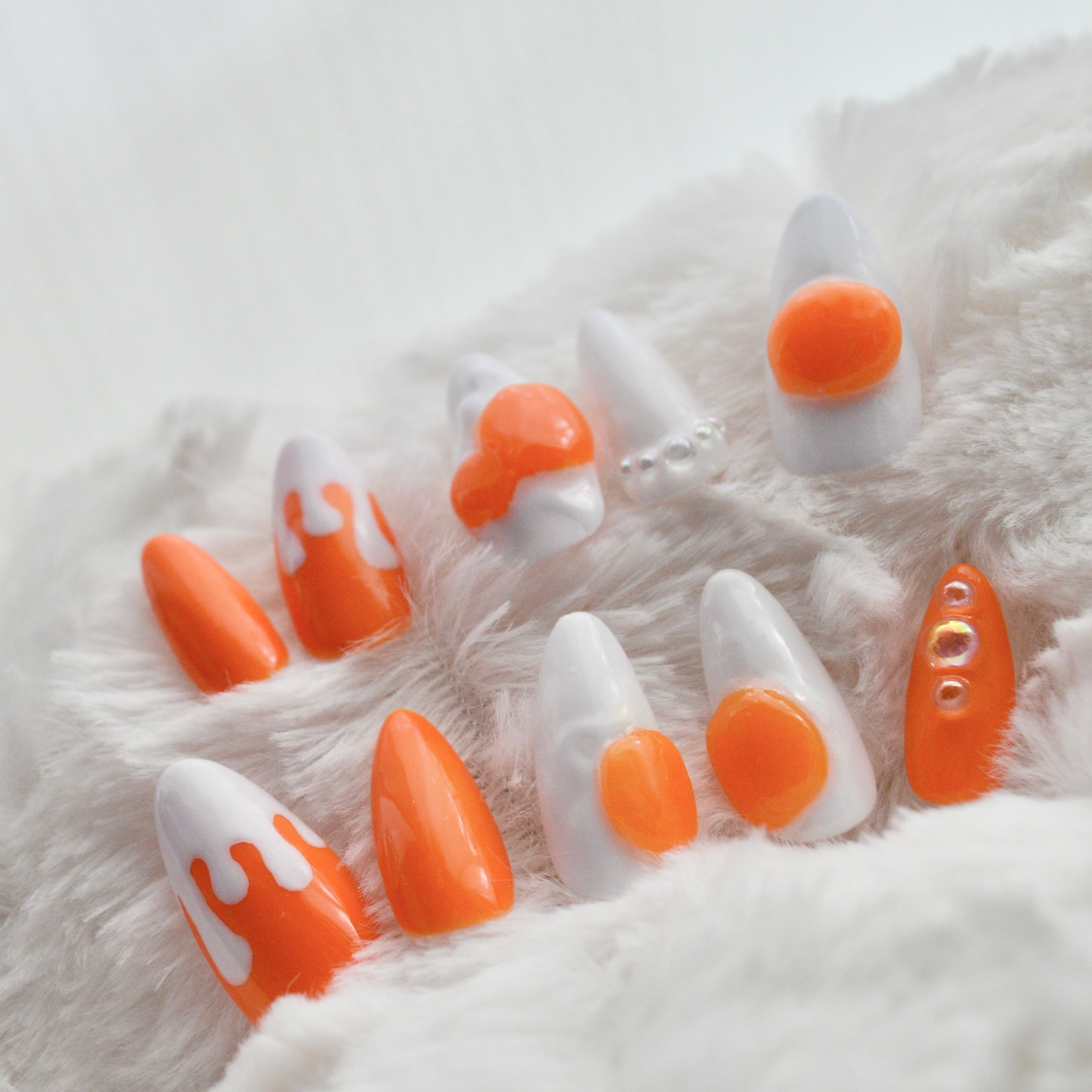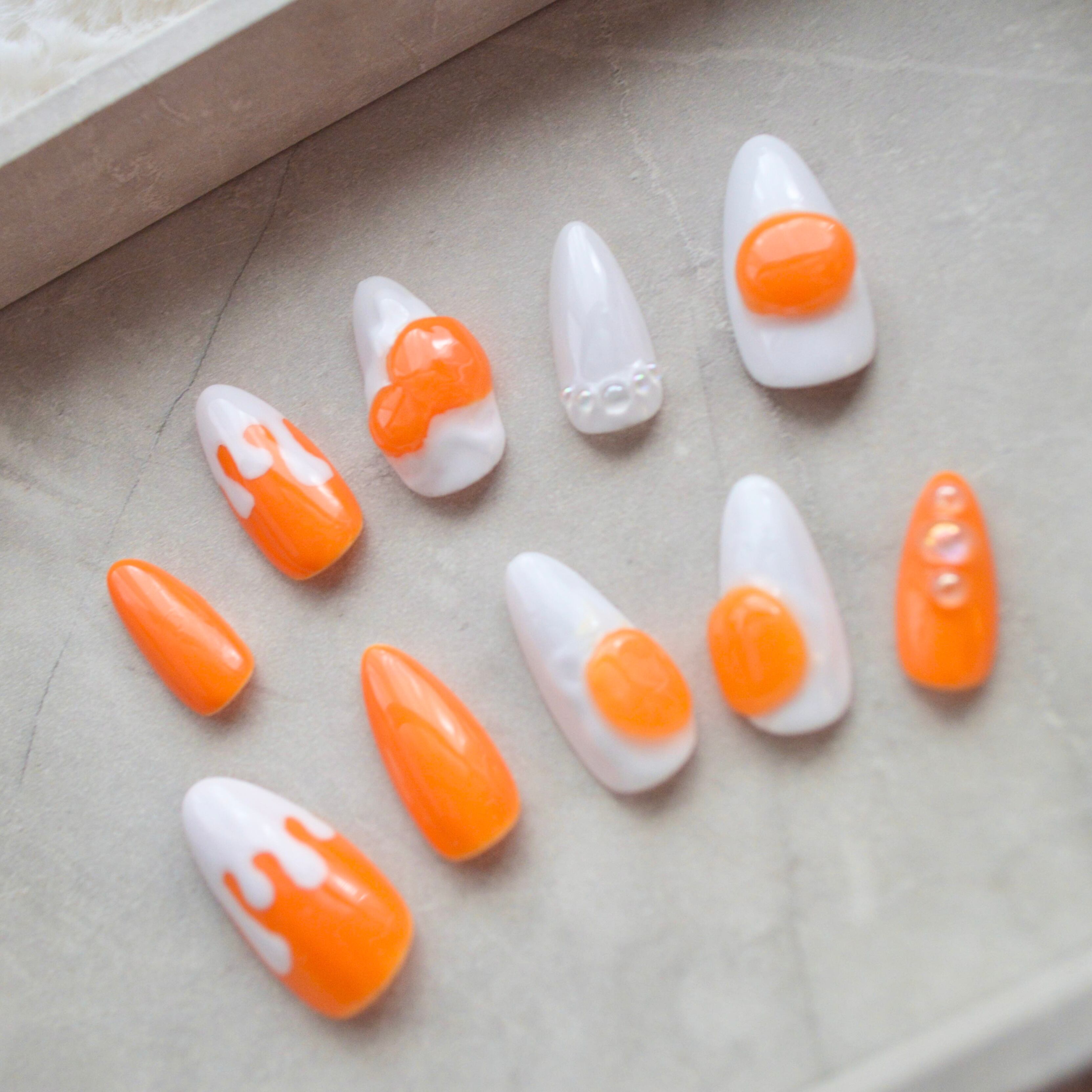 編み物作品の着用モデルをしてくださっている縡さんが作成してくださった、樽型異星人のオリジナルキャラクター「たまごコロニー」イメージのネイルチップです。