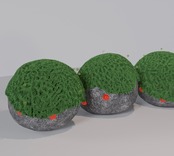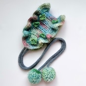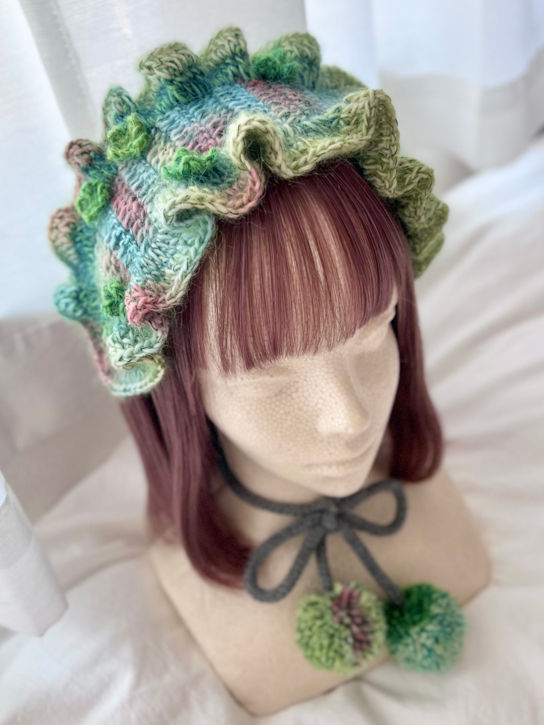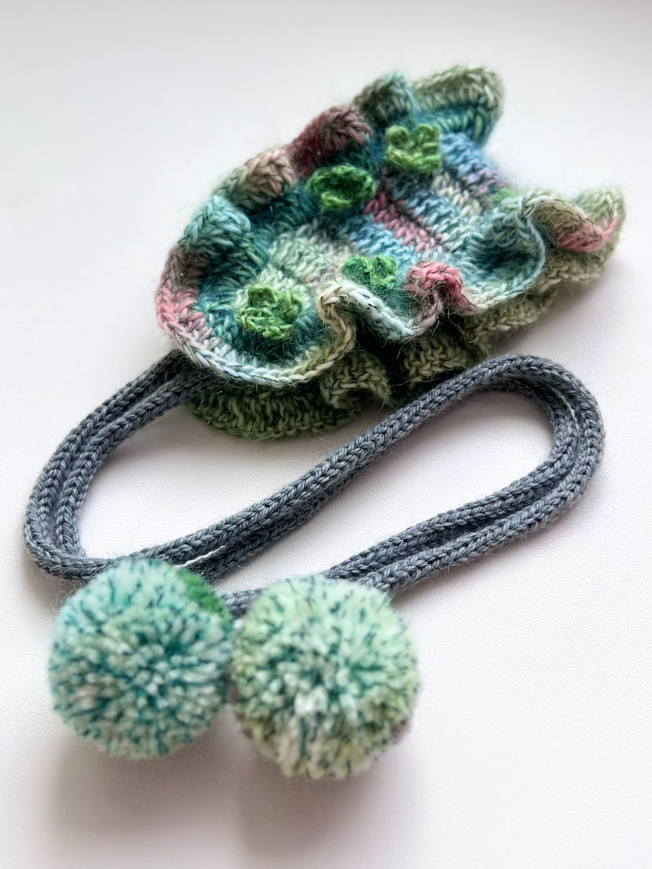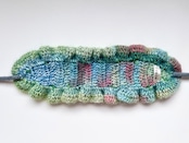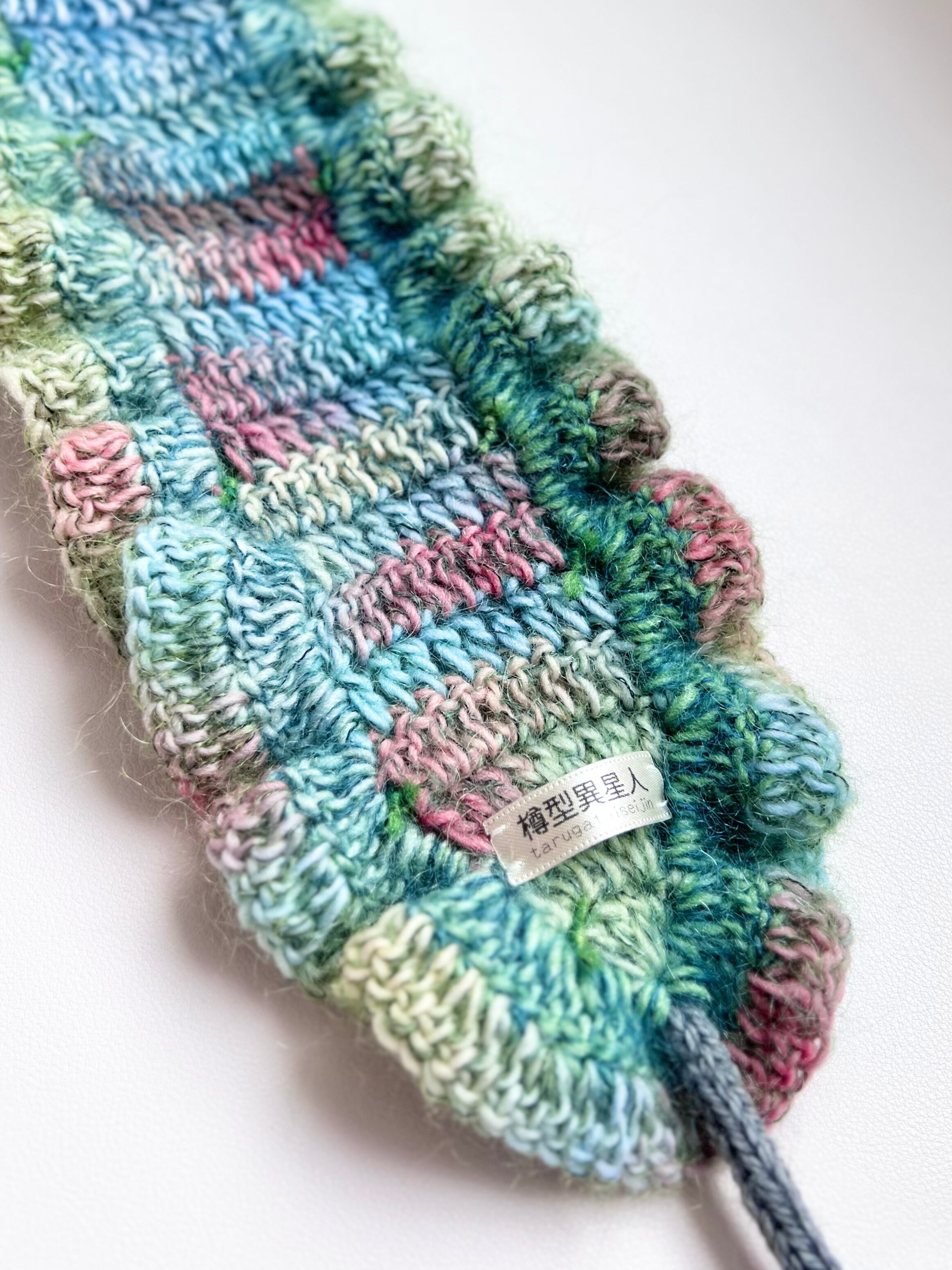 ムカデ石の頭に生えたふさふさの苔をイメージした作品です。使用した毛糸にはグリーンをメインにピンクやブルーなど様々な色がが混ざっており、ラメが入っている部分は光に当たると朝露のようにキラキラと光り神秘的です。