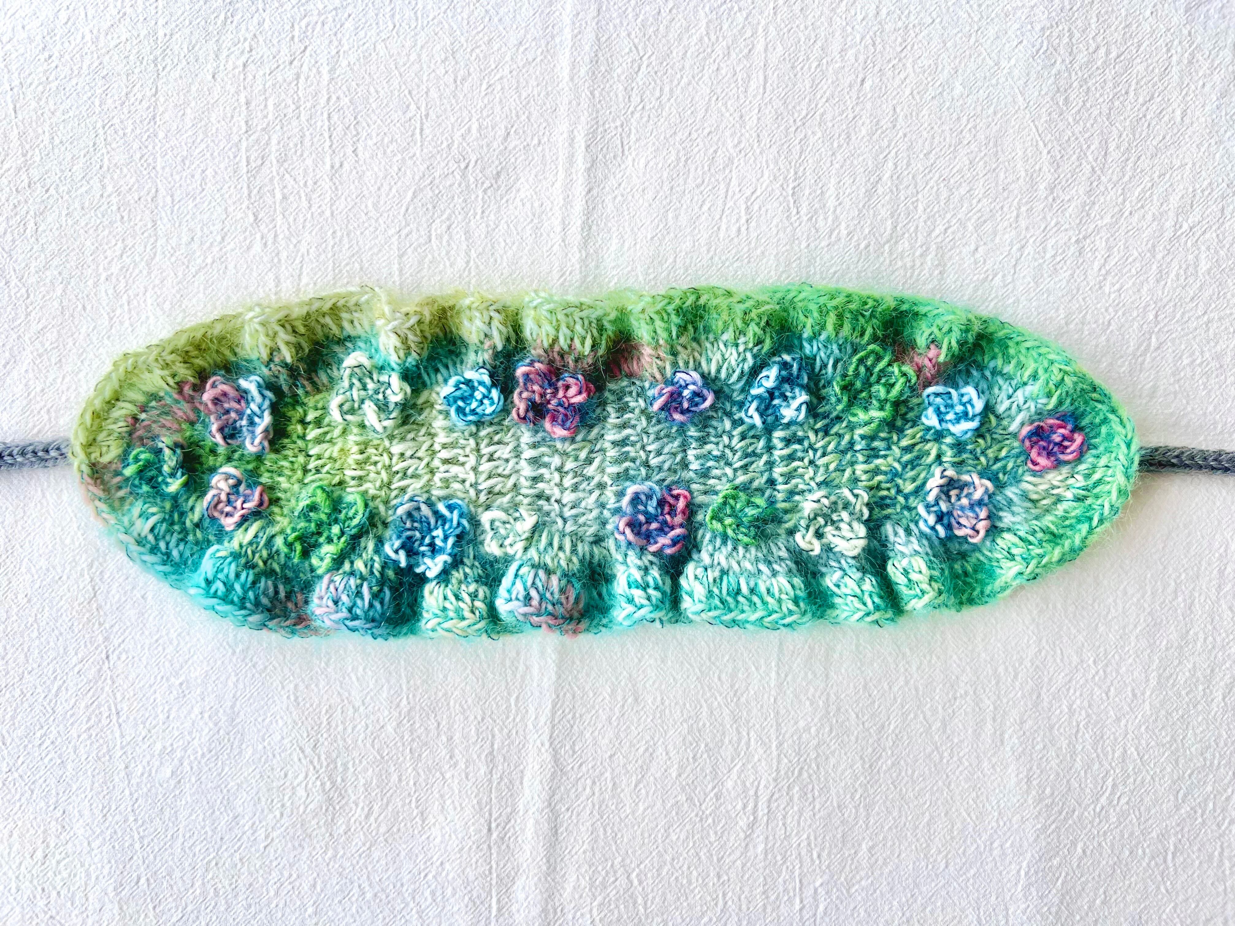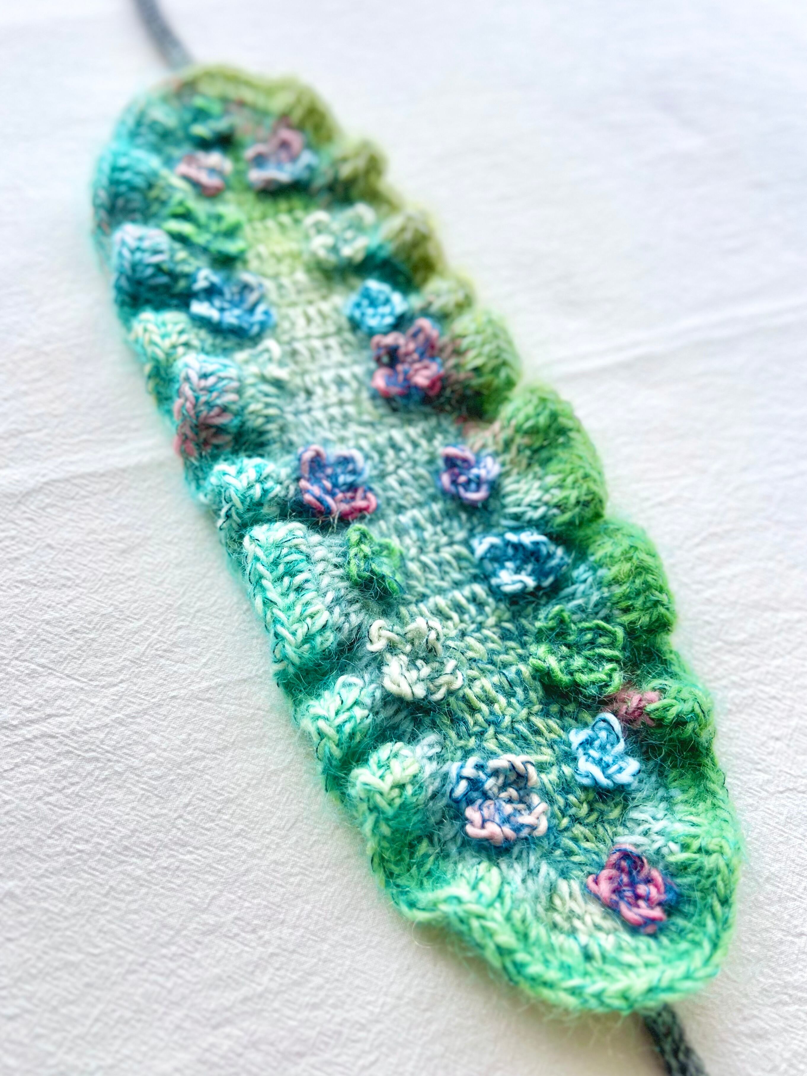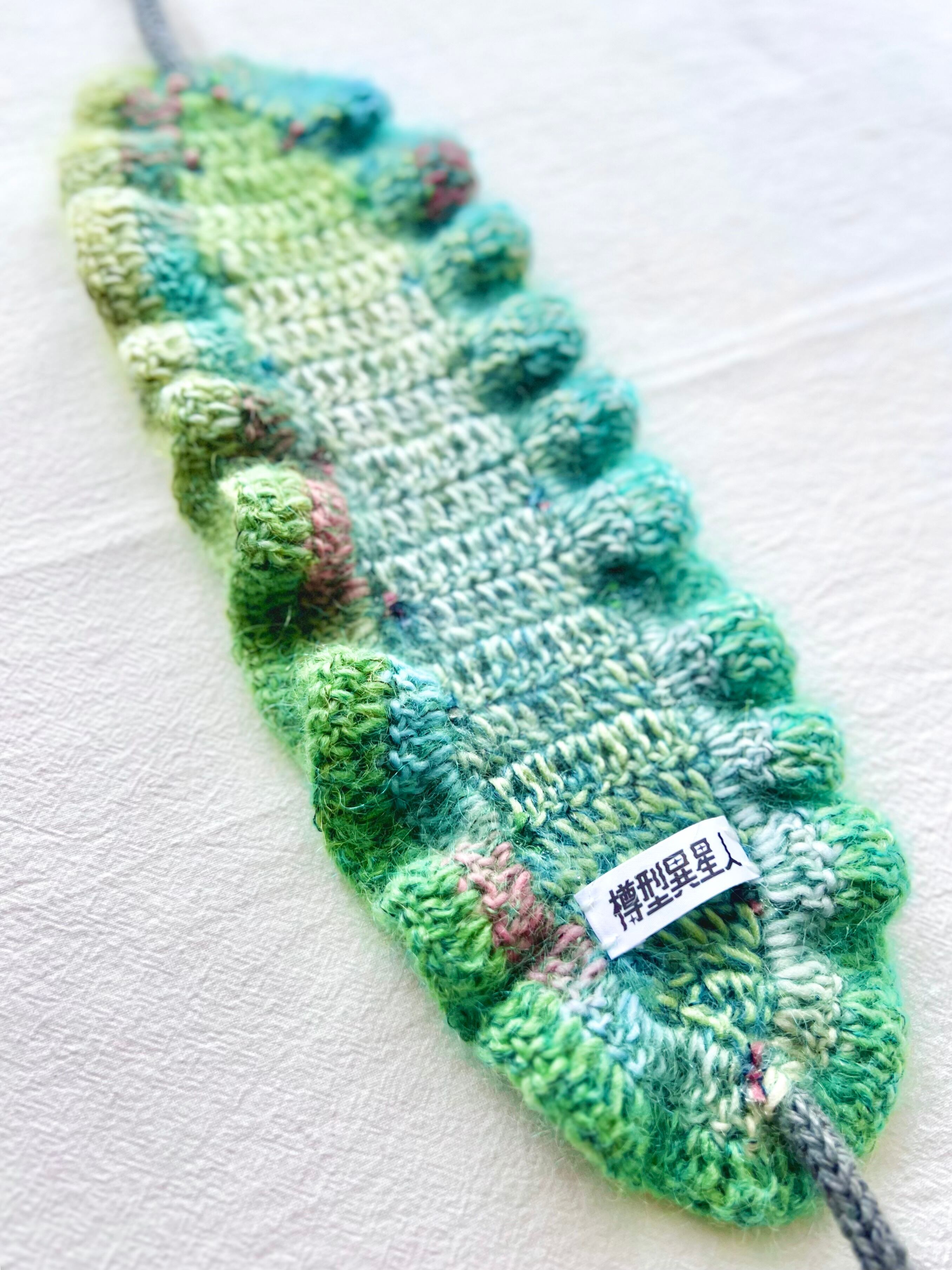 ムカデ石の頭に生えたふわふわの苔をイメージした、全体に散りばめられた小花がかわいらしい作品です。使用した毛糸にはグリーンをメインにピンクやブルーなど様々な色がが混ざっており、ラメが入っている部分は光に当たると朝露のようにキラキラと光り神秘的です˖ ࣪⊹