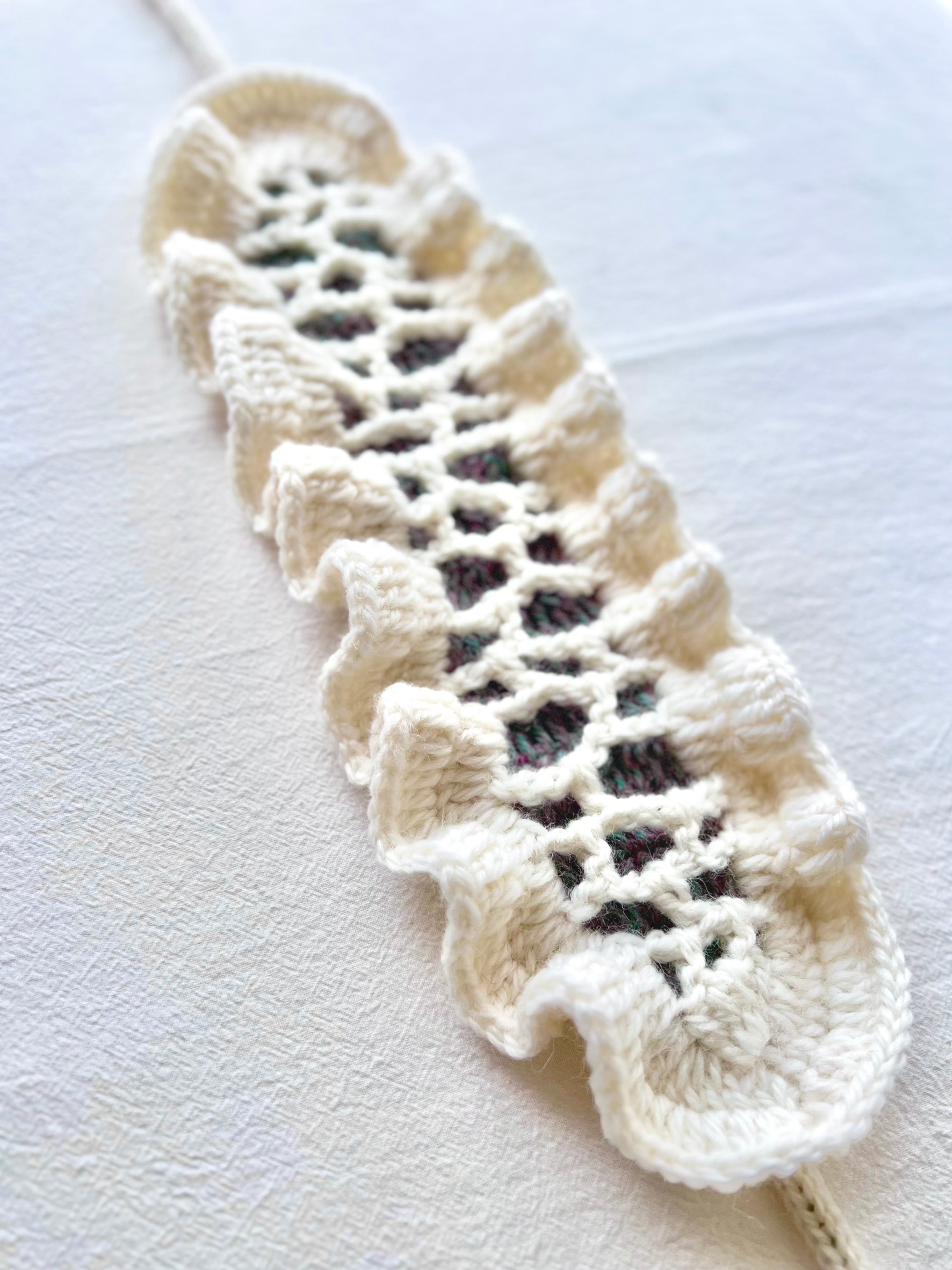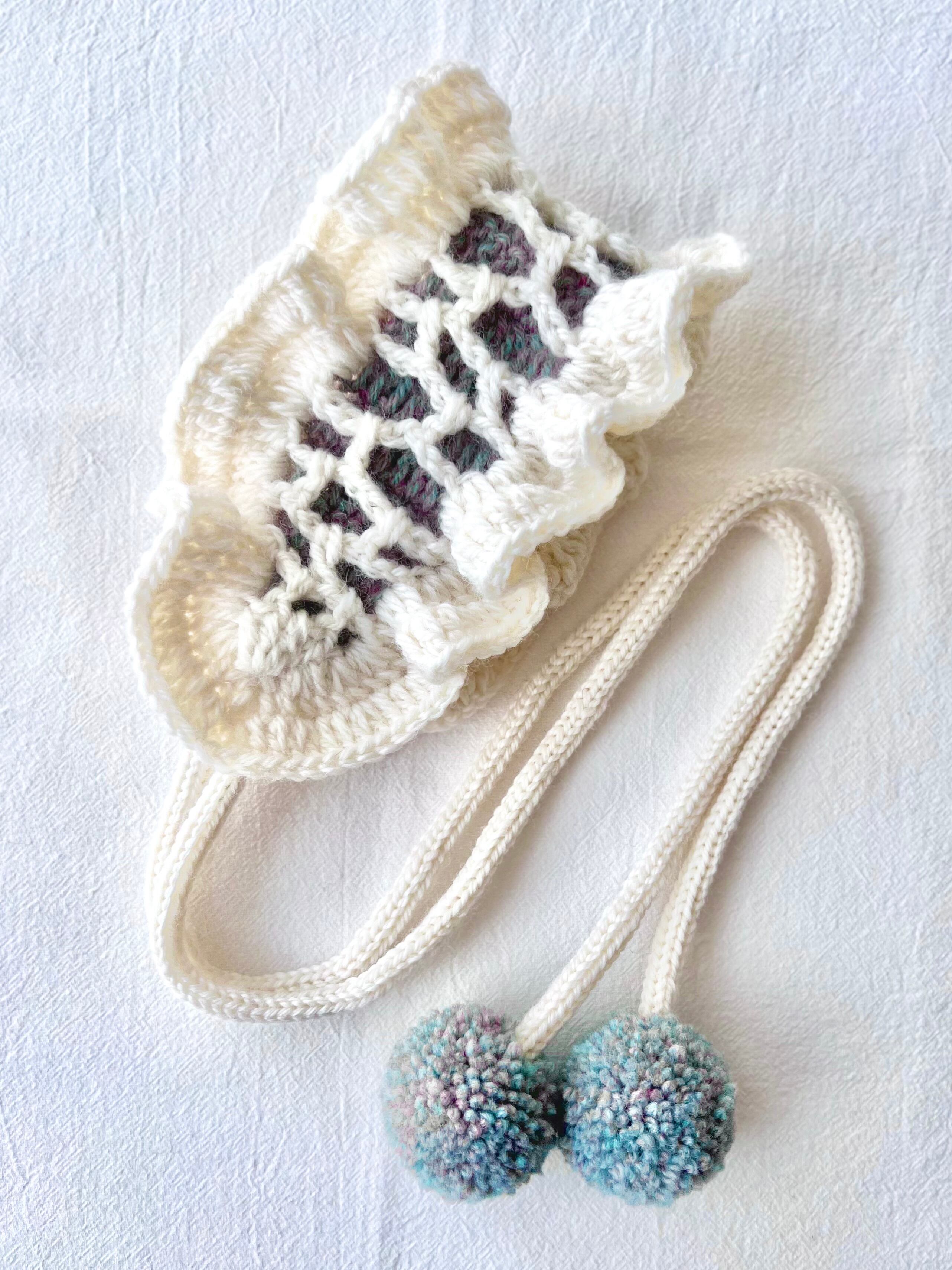 きぬクジラの頭部をイメージした網目模様と、たっぷりのフリル、そしてきぬクジラ頭部に浮かぶ金属の球体をイメージしたポンポンを紐に付けた作品です˖ ࣪⊹