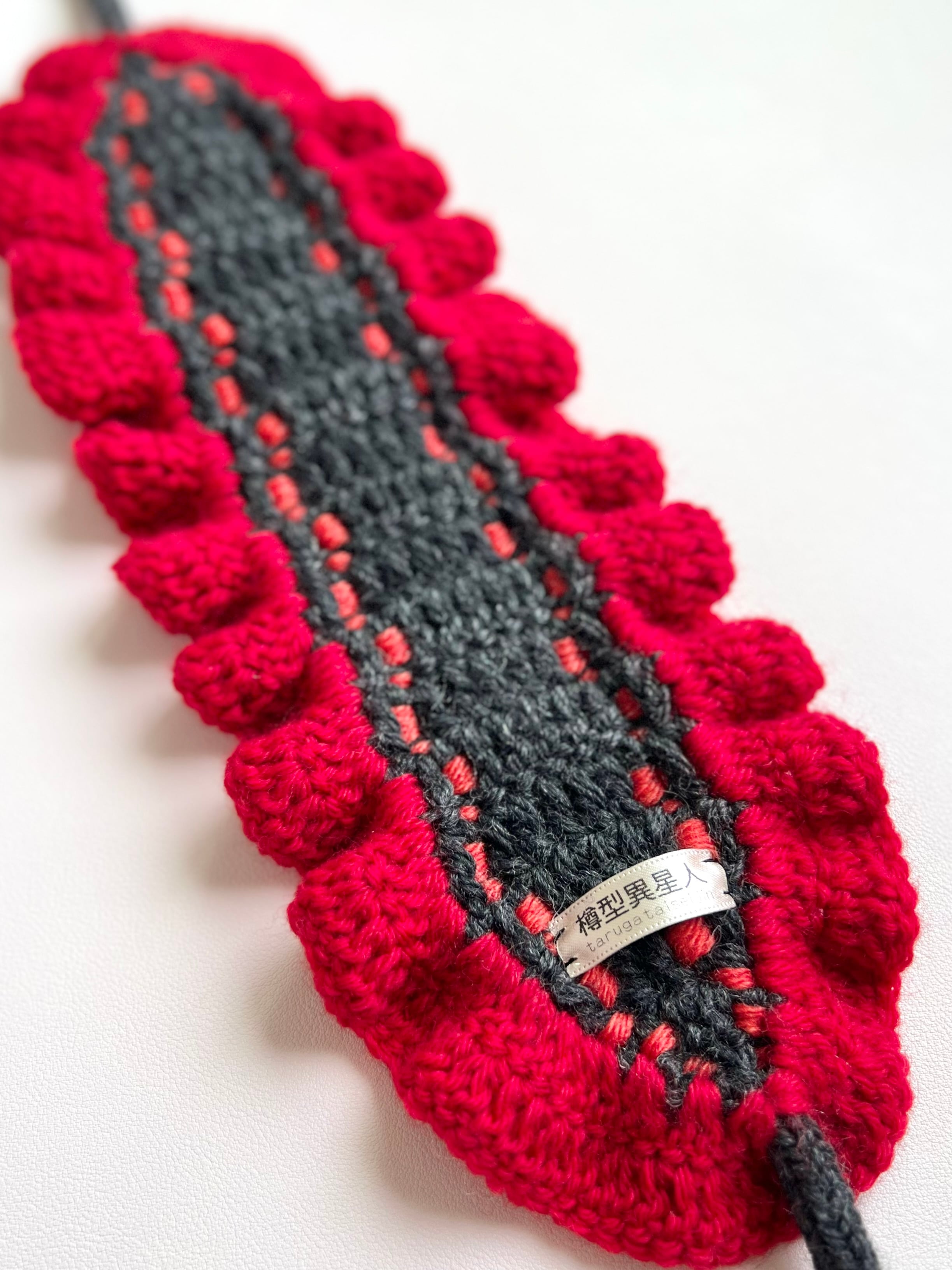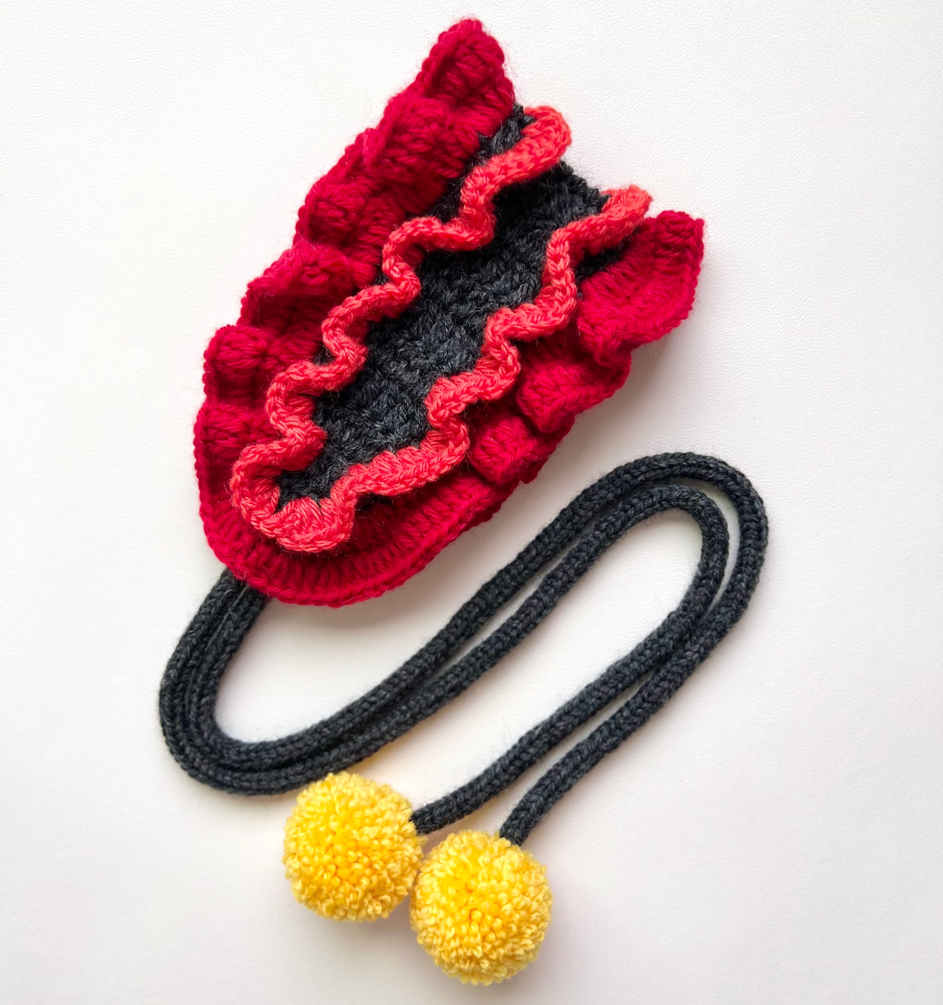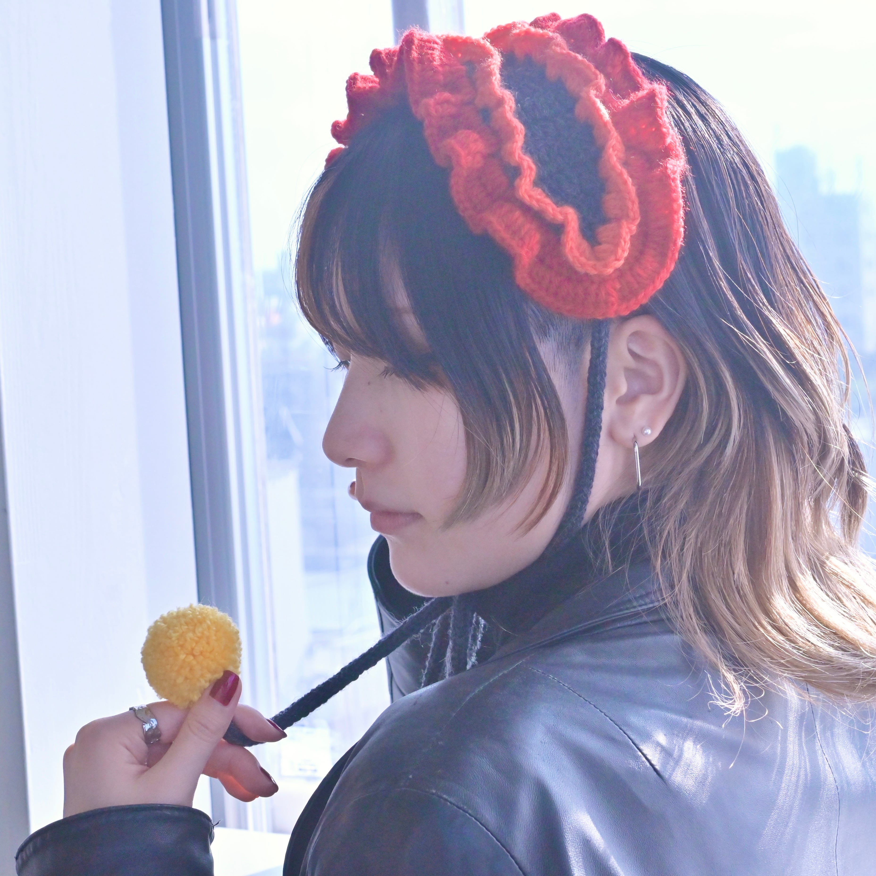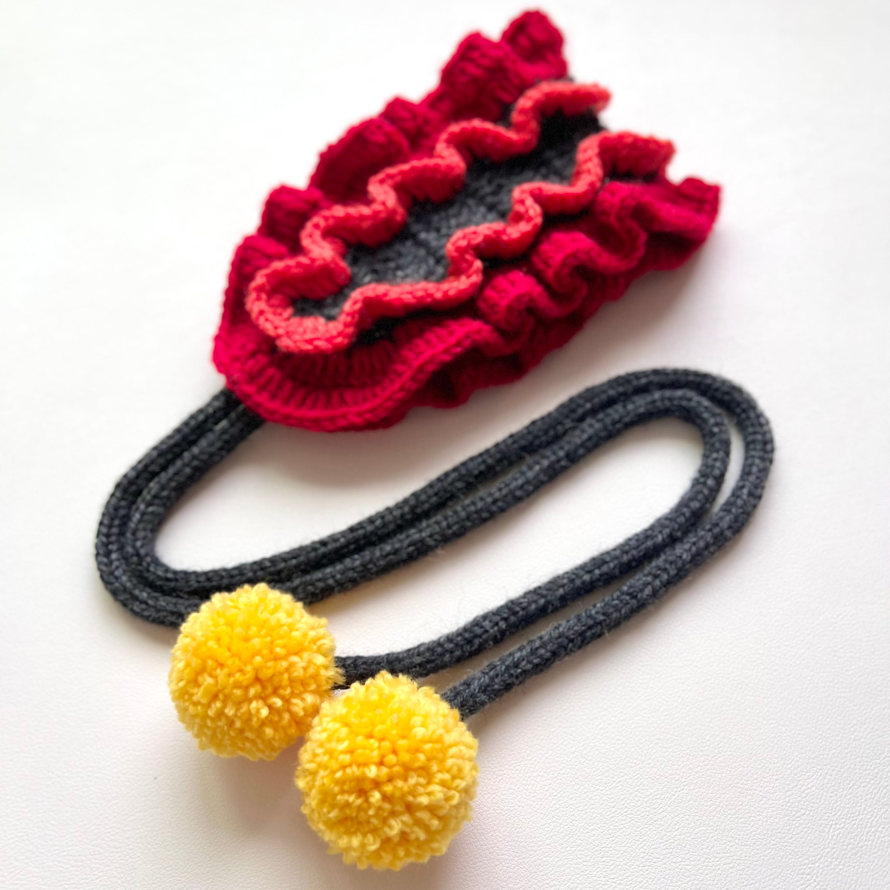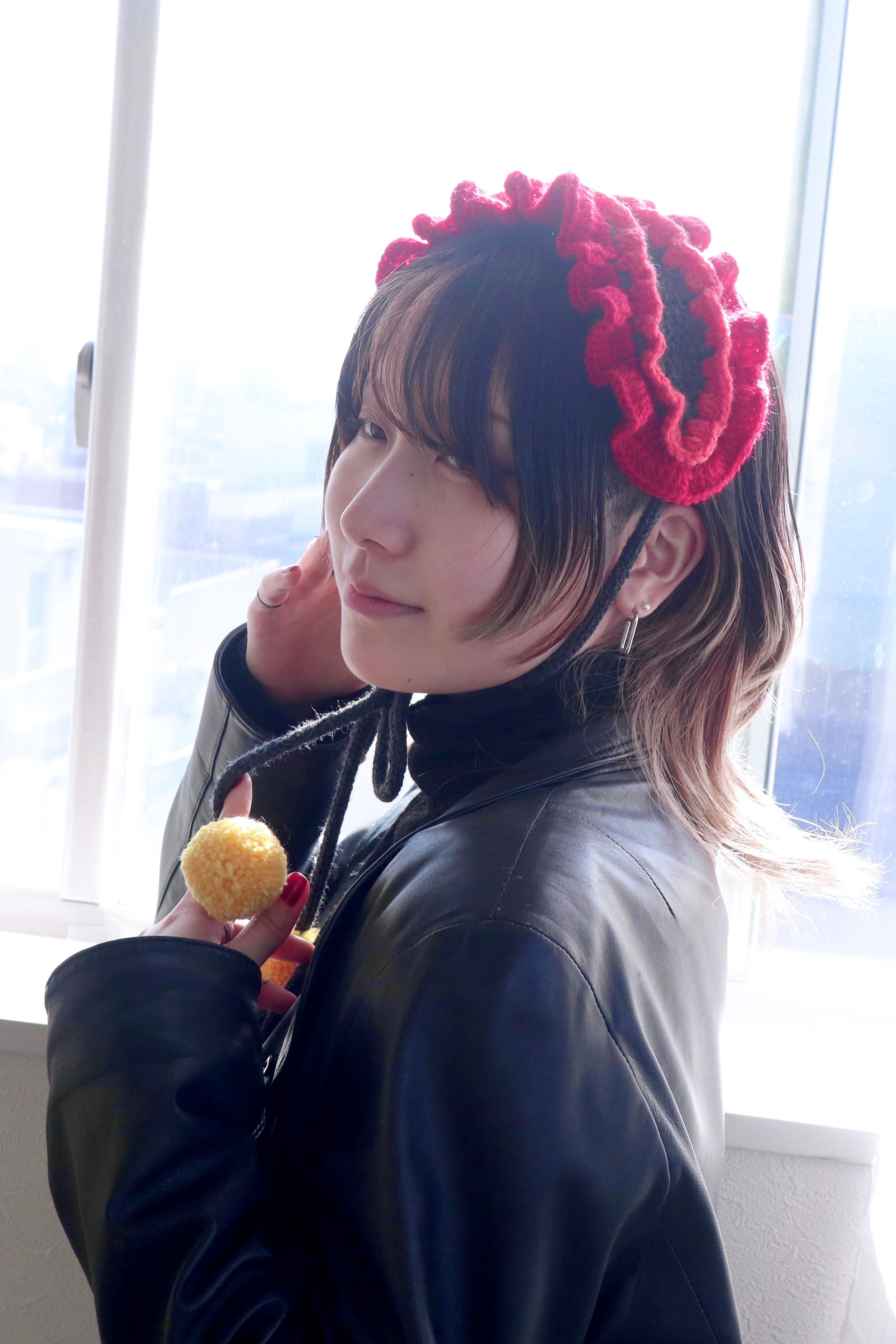 ラフレシアとかげの花びらをイメージした、2段の色が異なるフリルが上品でいて存在感のあるヘッドドレスです。ポンポンにはラフレシアとかげの目玉の色をイメージした黄色の差し色を使い、より個性的でポップな印象になりました⸝꙳.⋆