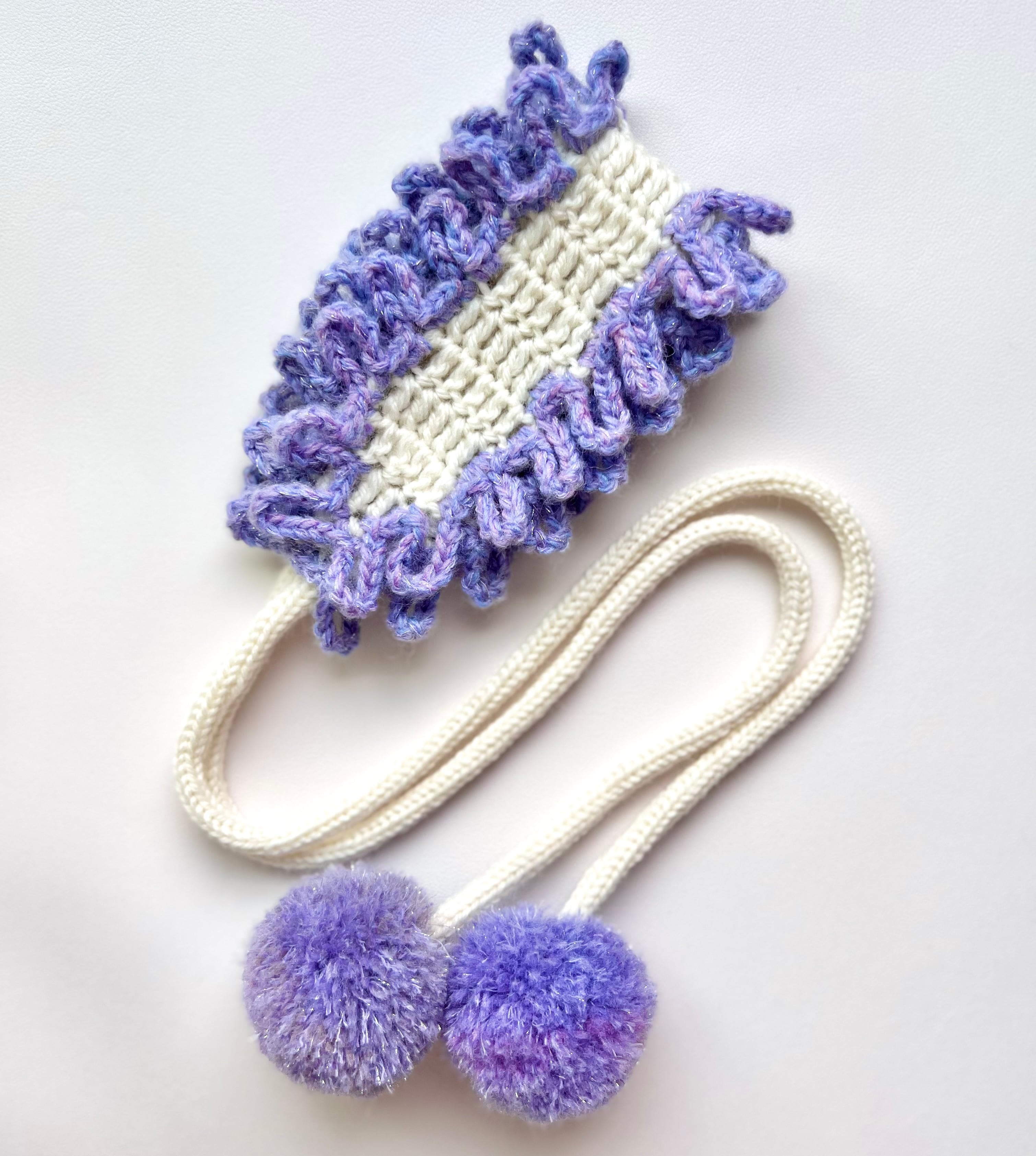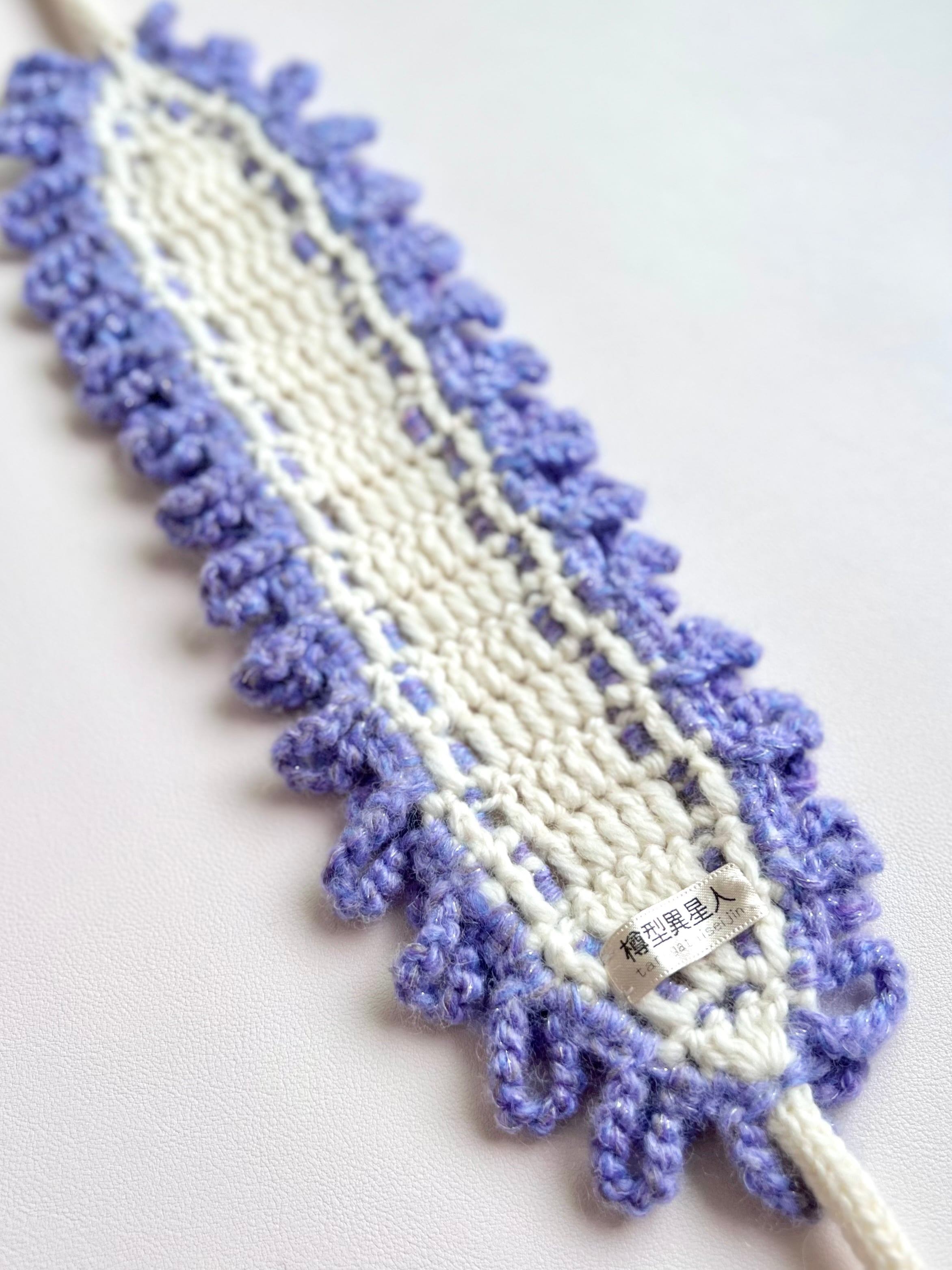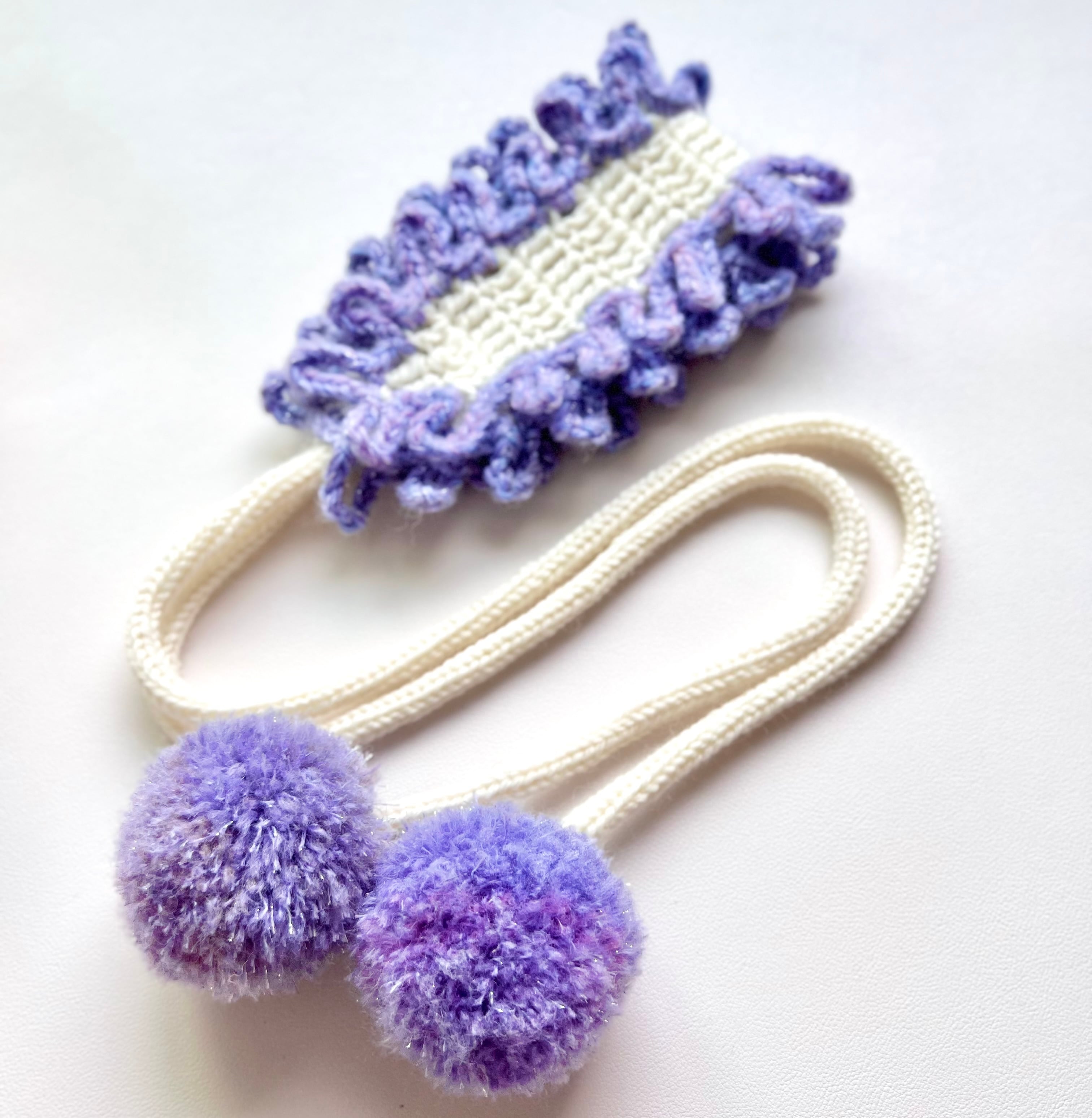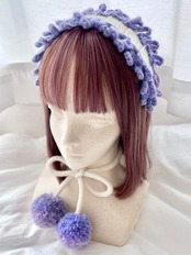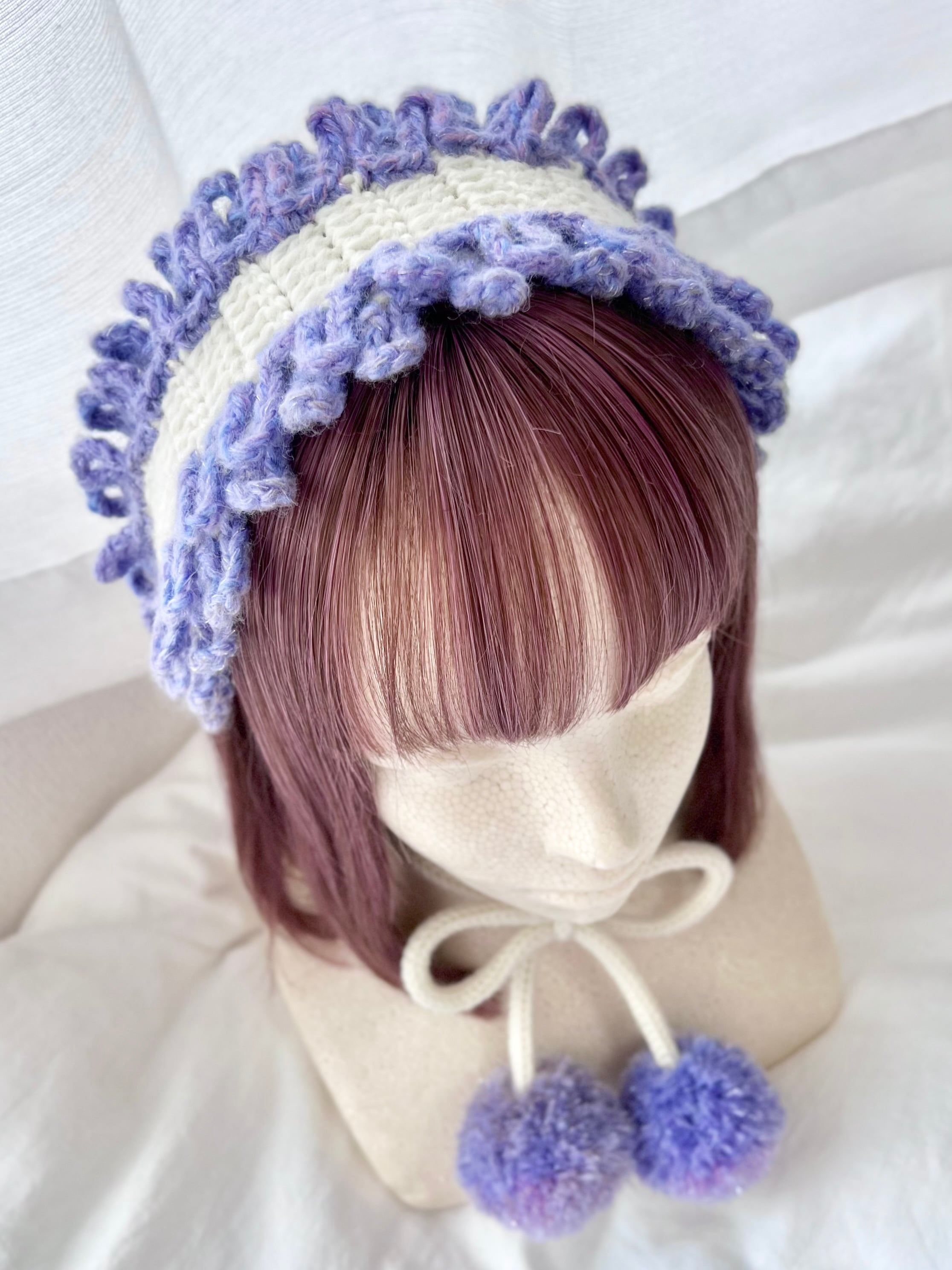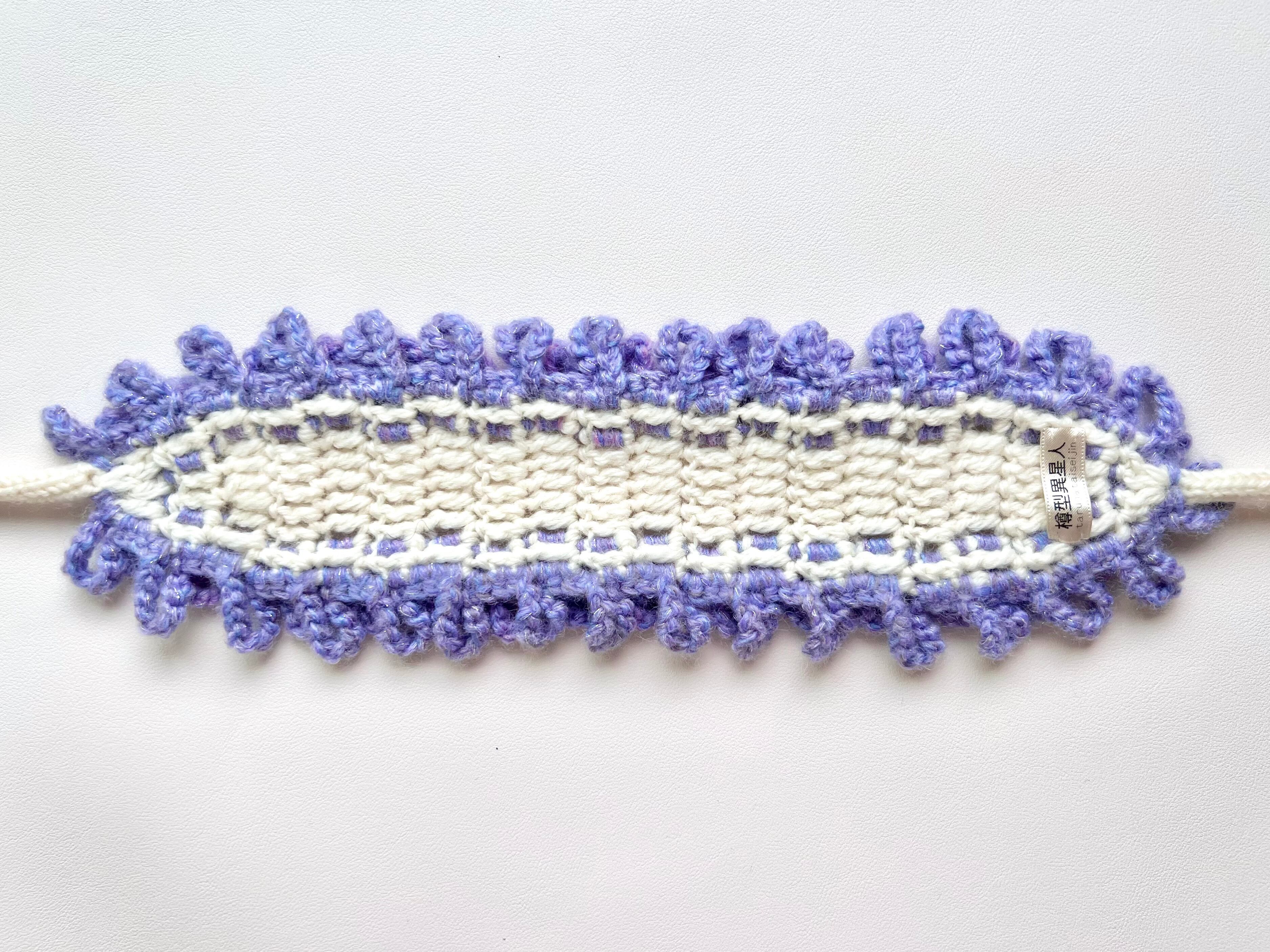 なめくじキノコの触手をイメージしたパターンを淡い紫色のグラデーション毛糸でフリルのように全体を囲んだ上品で華やかなヘッドドレスです。紫色の毛糸にはラメ色が入っているため、夜に発光するなめくじキノコのようにキラキラと輝きます⋆˙⟡