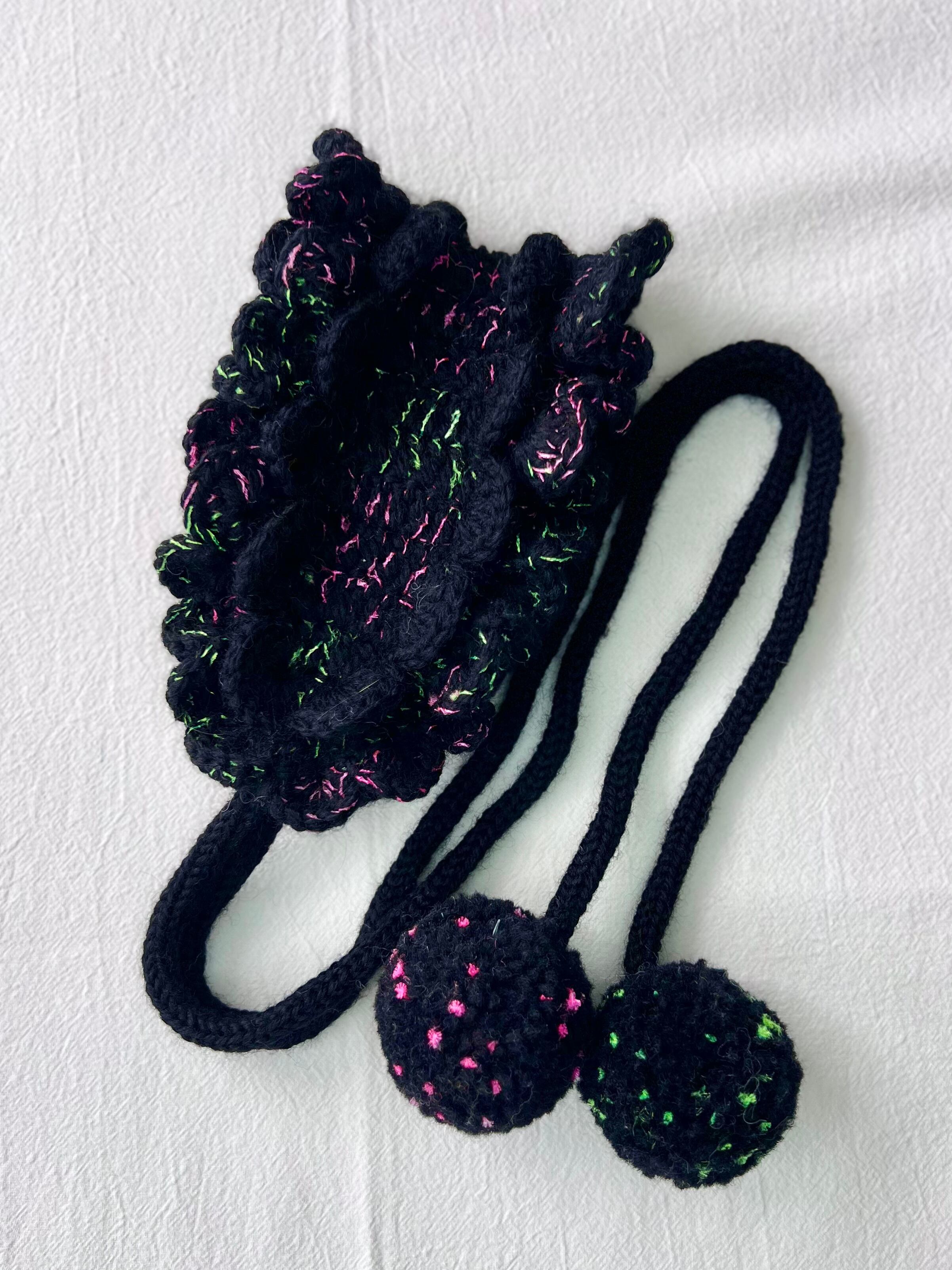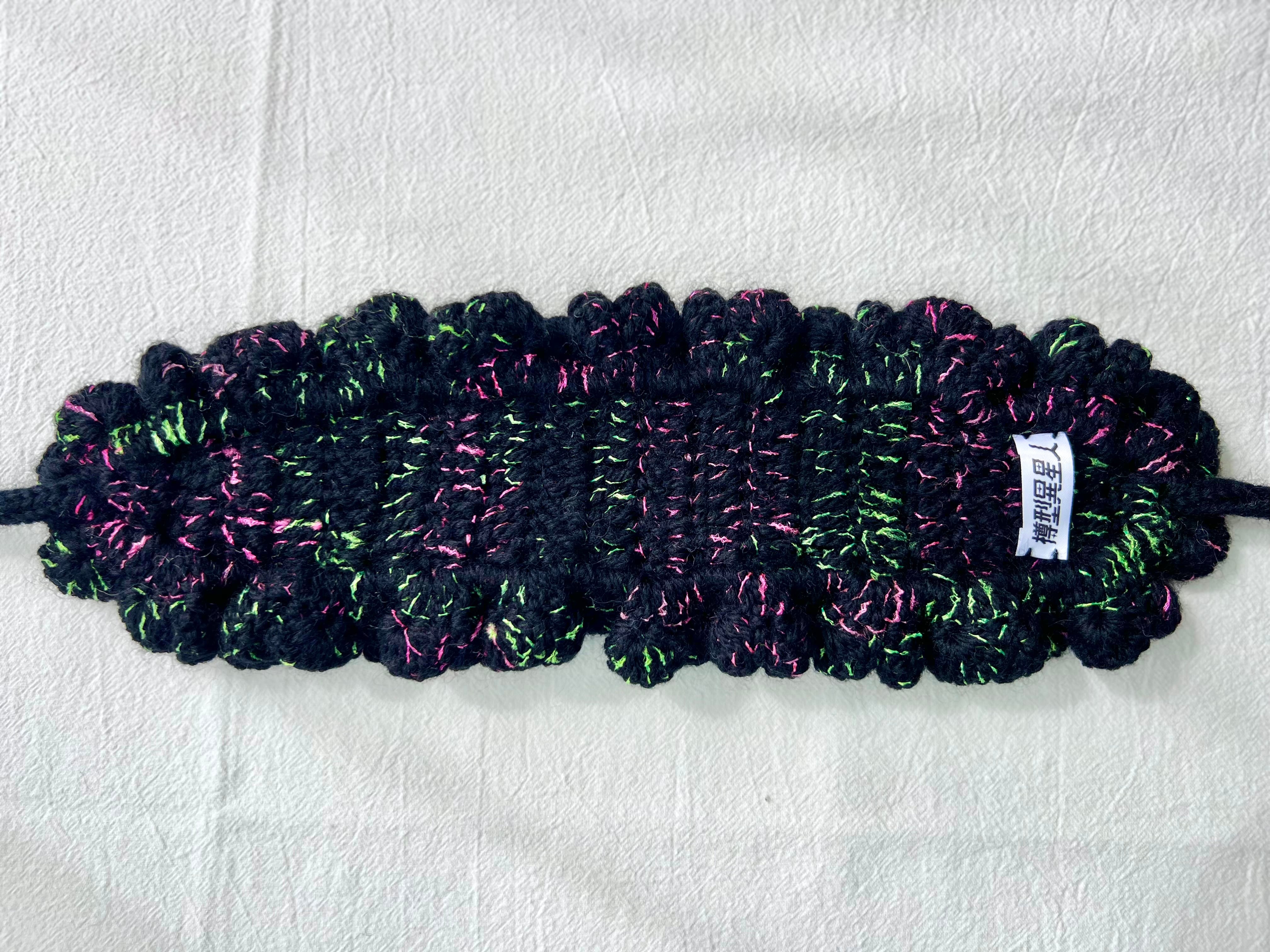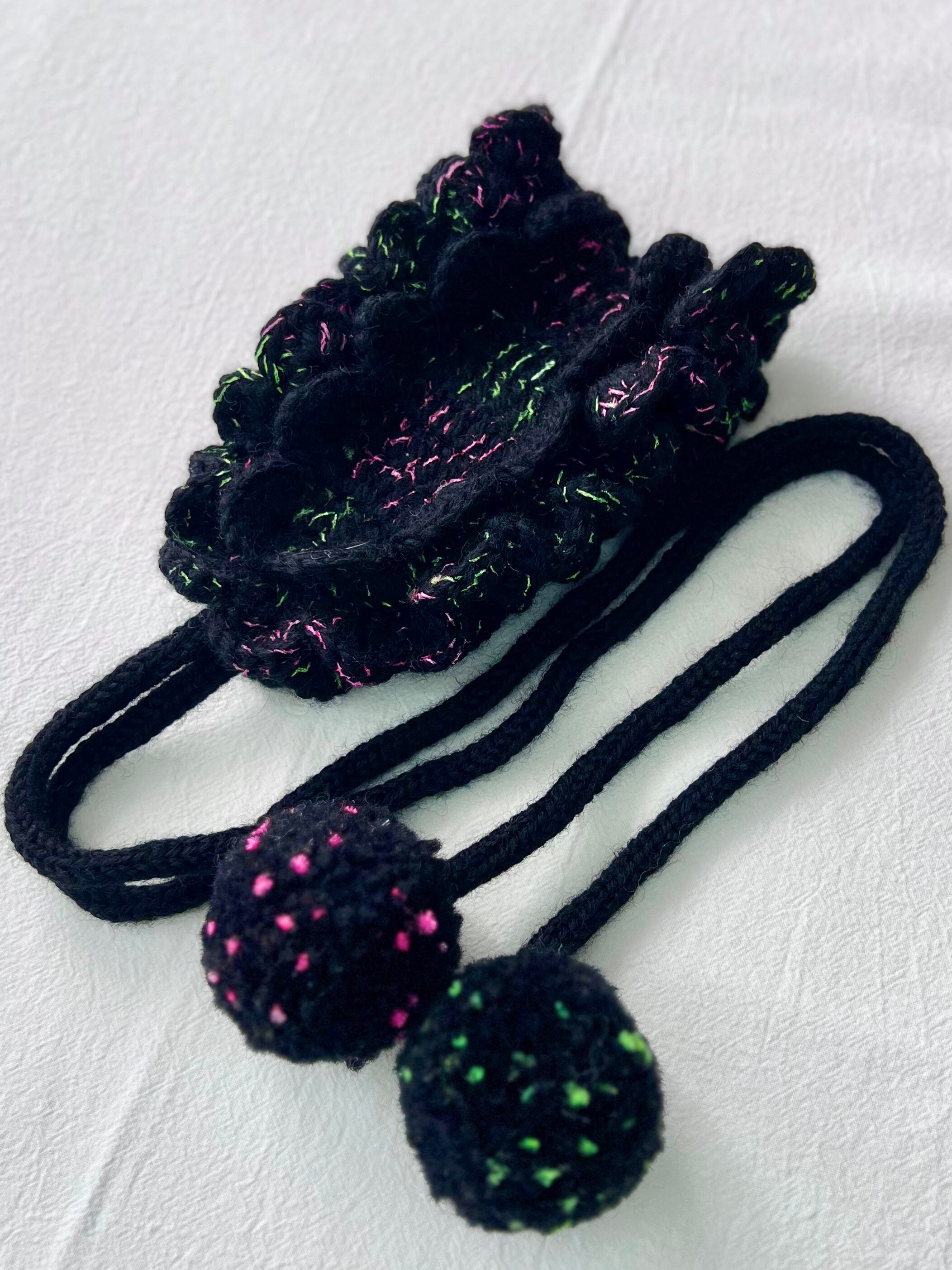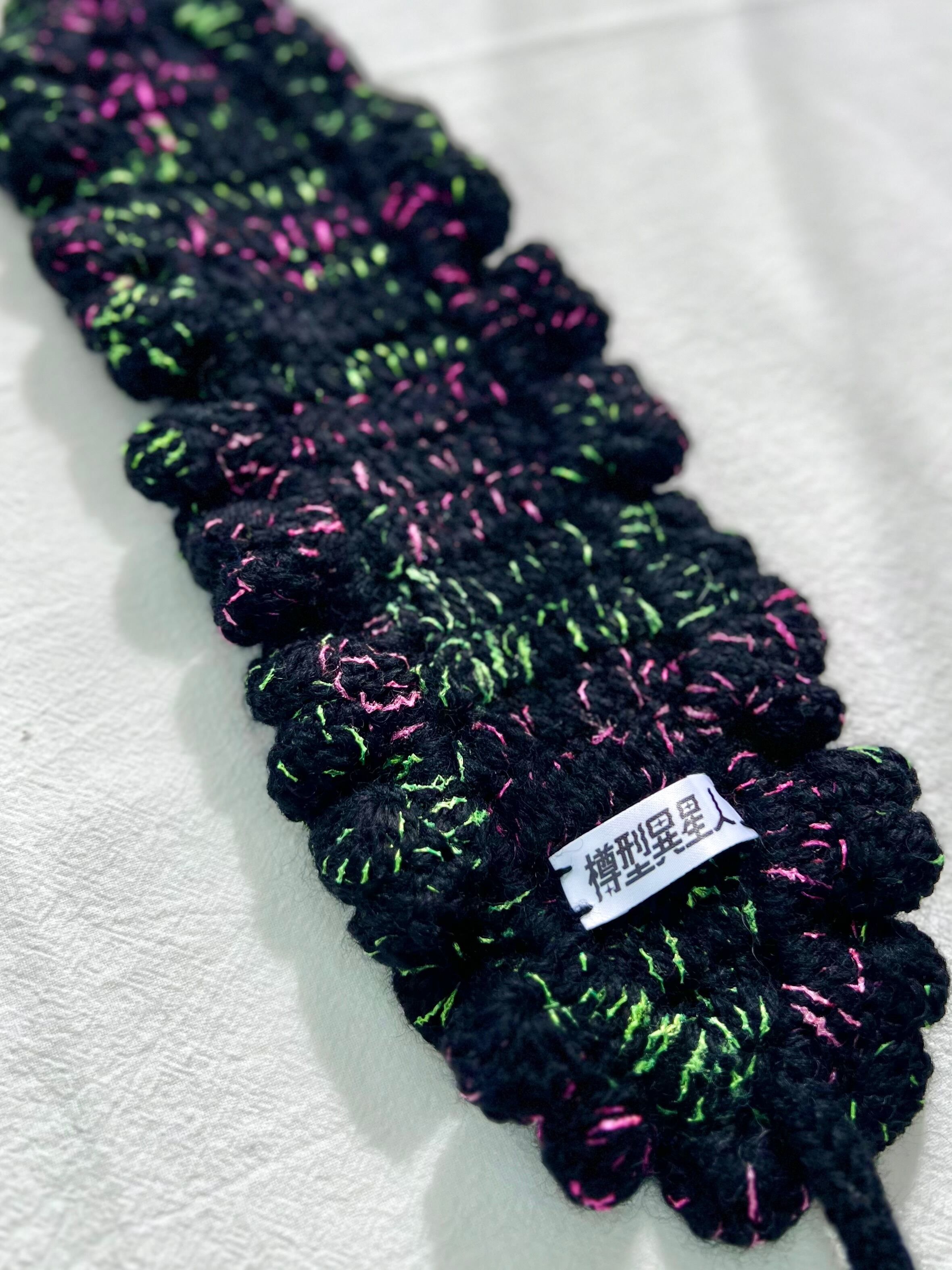 海の底で浮遊する、カイロウうみうしのシャボン玉のようなきらめきをイメージした作品です。真っ黒な毛糸に蛍光カラーのピンクとグリーンのファンシーヤーンをランダムに引き揃えて編んでおり、深海を思わせる唯一無二の色合いに仕上げています⸝꙳.⋆