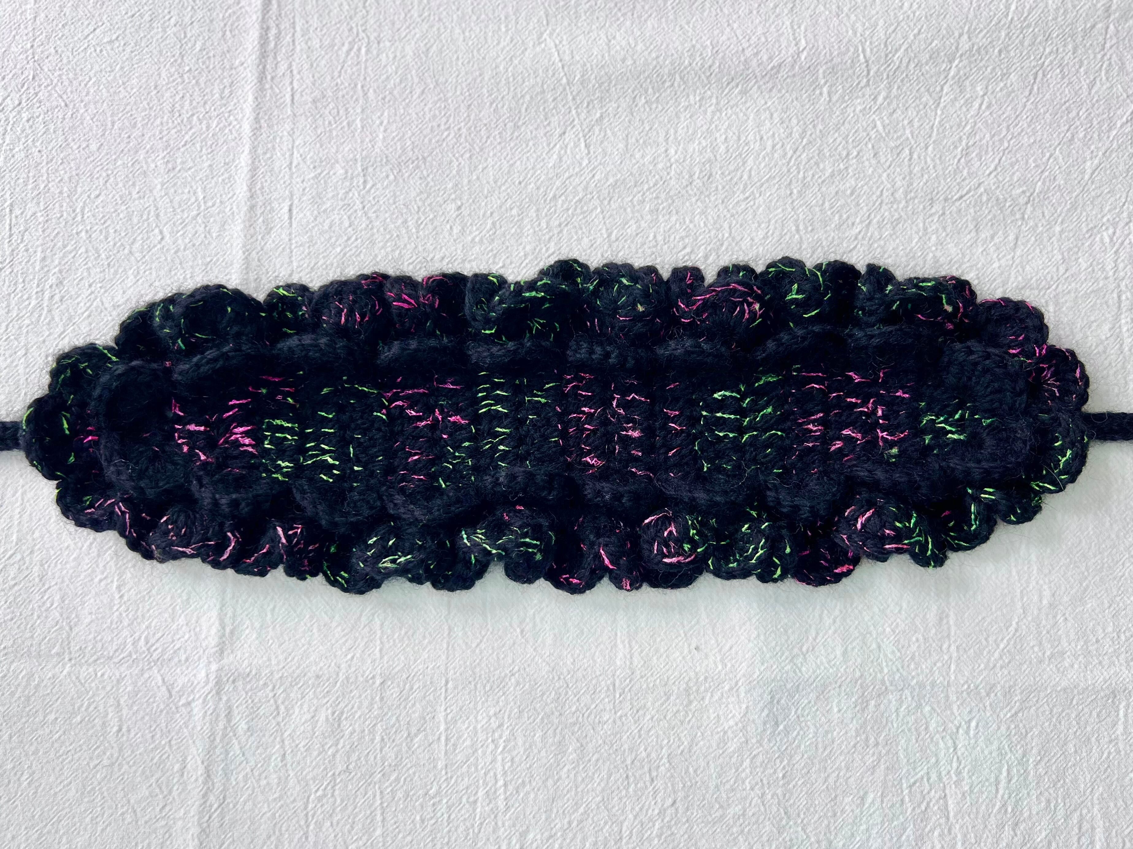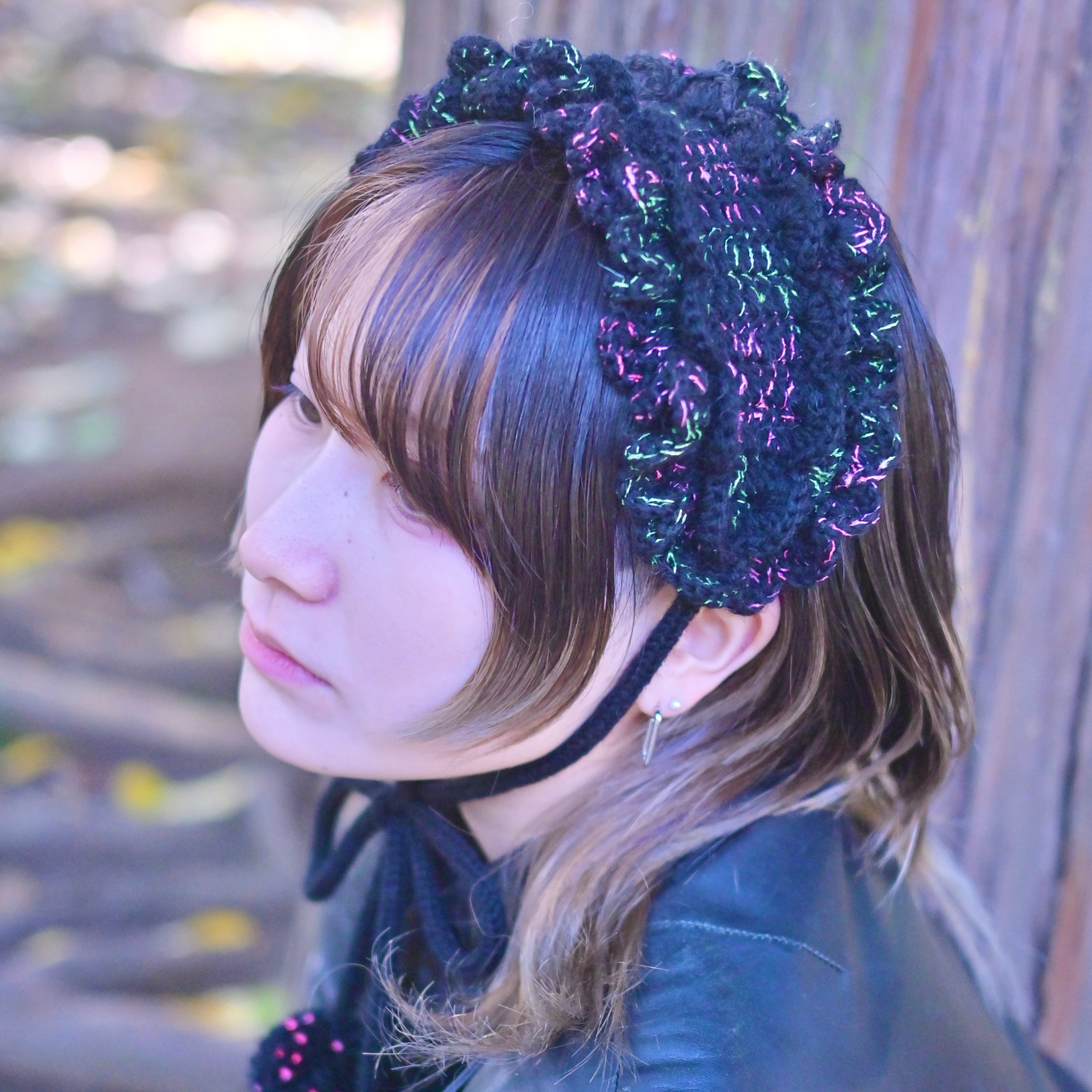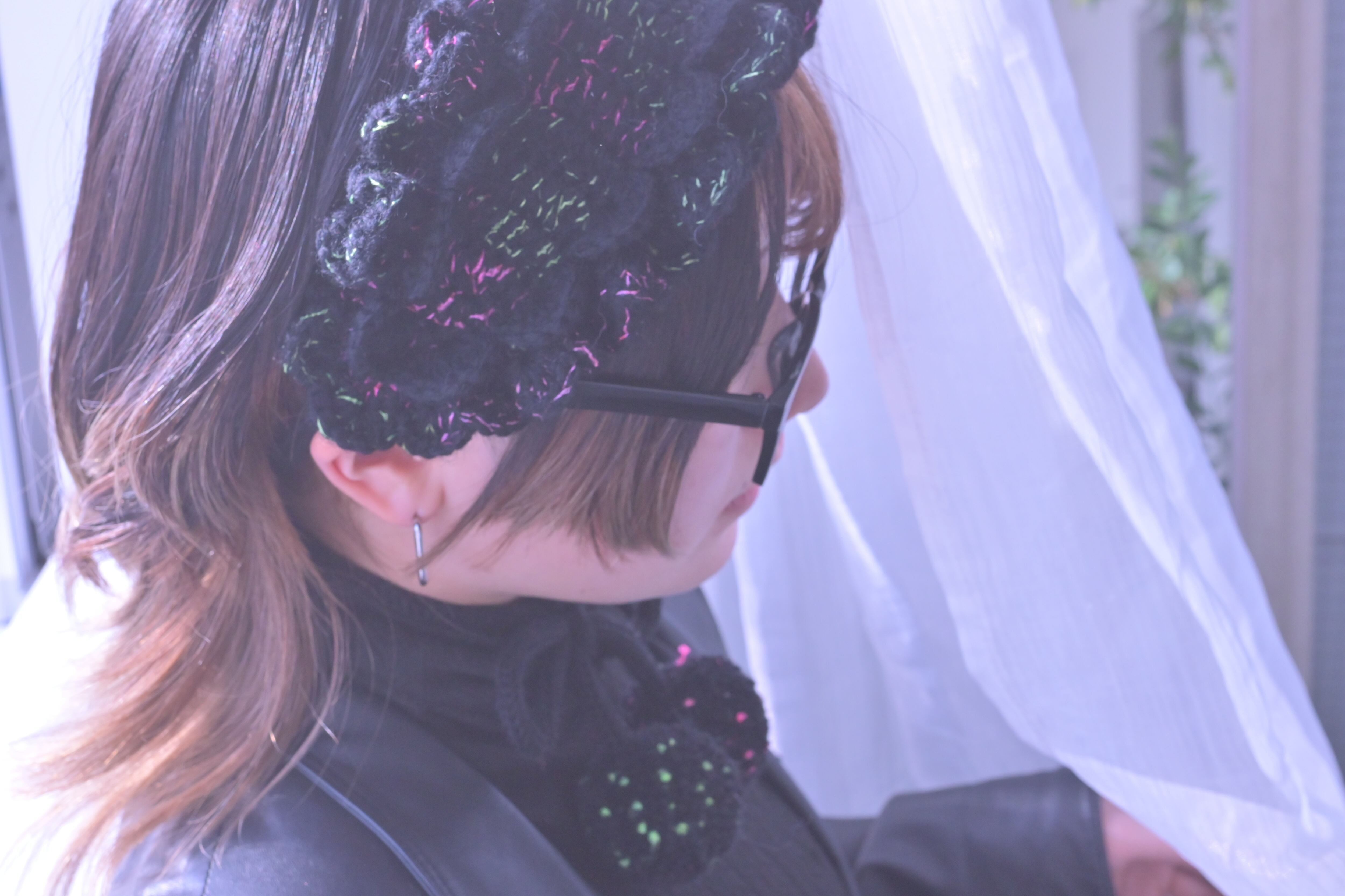 海の底で浮遊する、カイロウうみうしのシャボン玉のようなきらめきをイメージした作品です。真っ黒な毛糸に蛍光カラーのピンクとグリーンのファンシーヤーンをランダムに引き揃えて編んでおり、深海を思わせる唯一無二の色合いに仕上げています⸝꙳.⋆