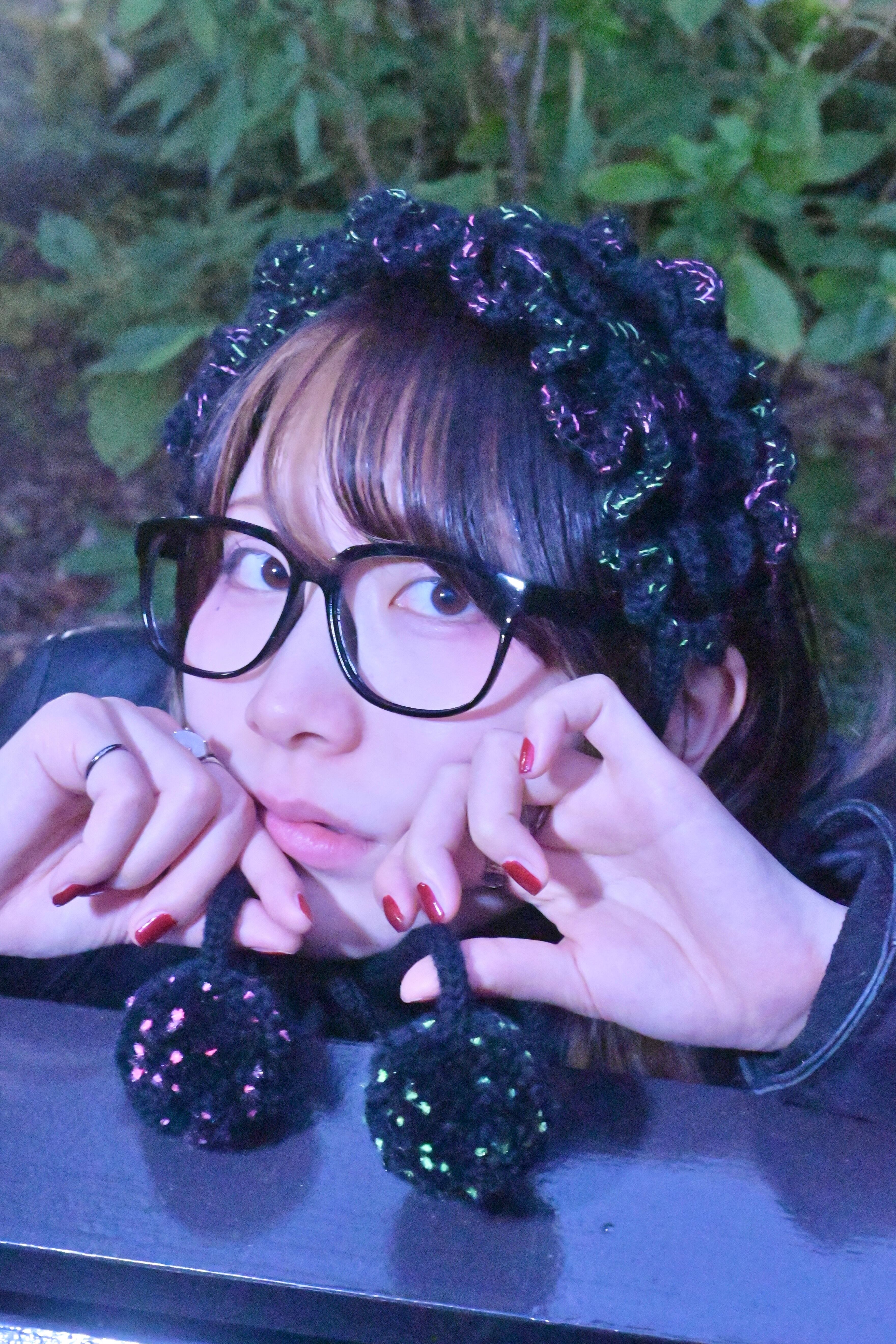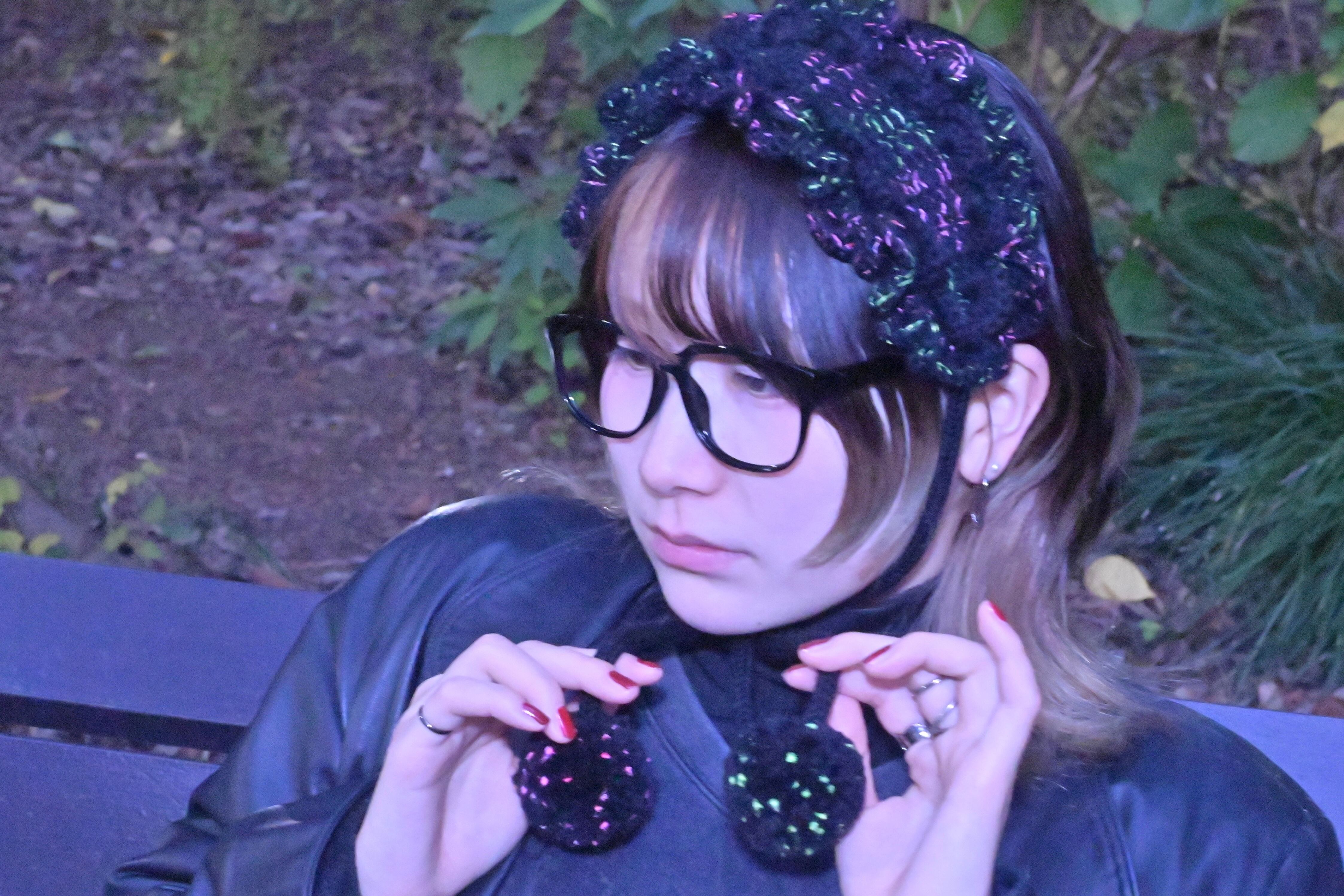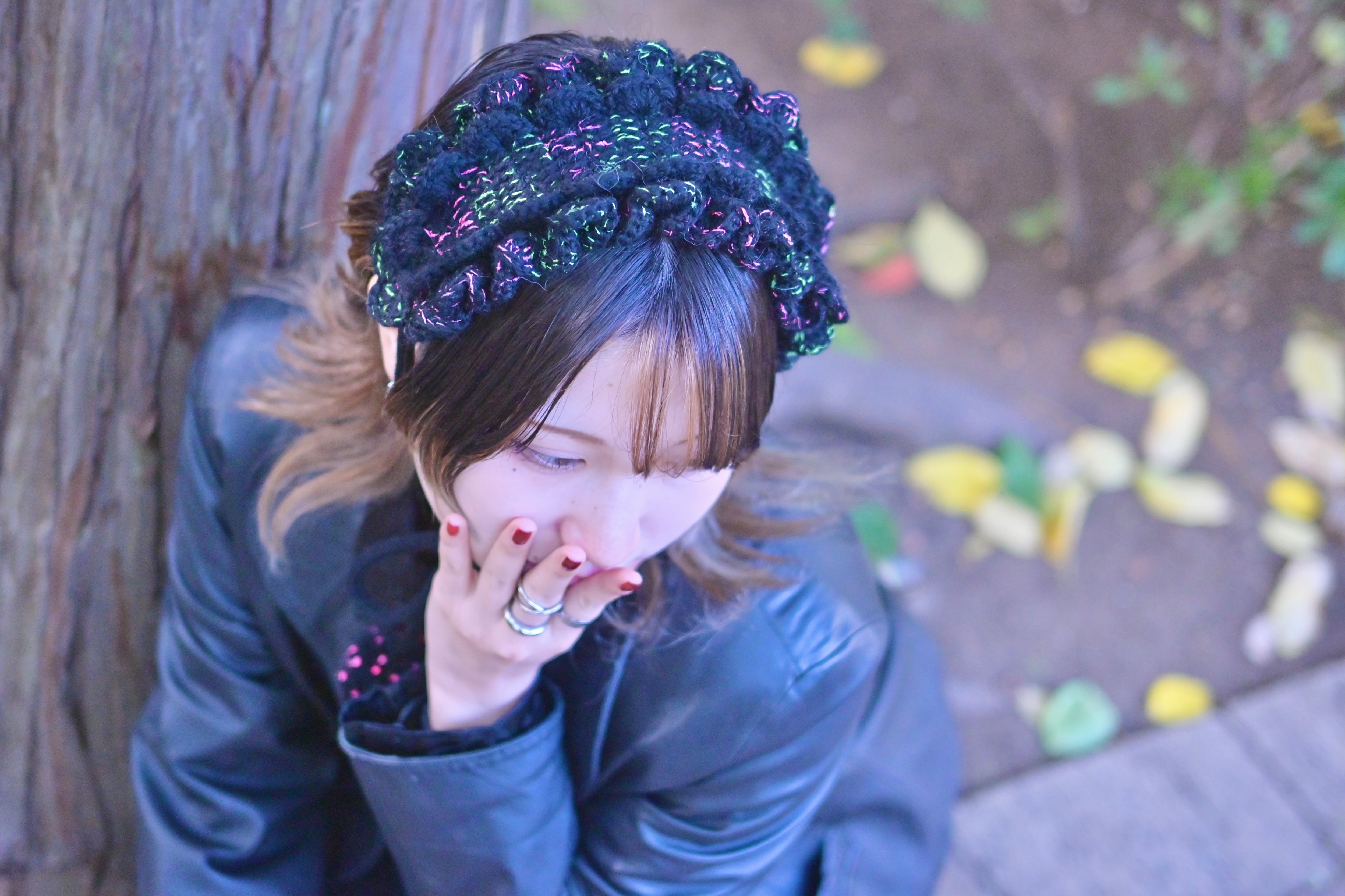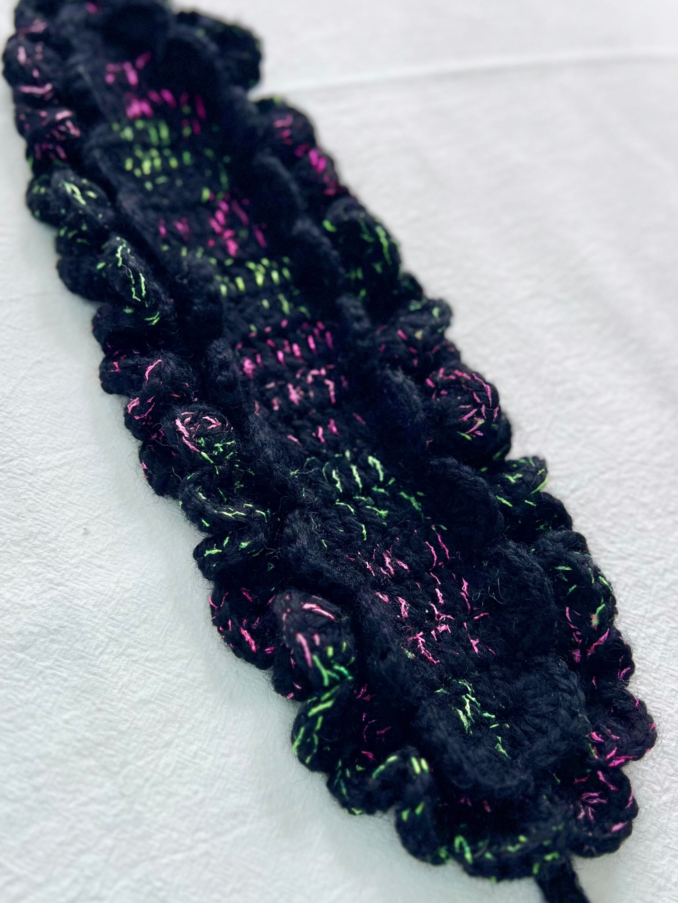 海の底で浮遊する、カイロウうみうしのシャボン玉のようなきらめきをイメージした作品です。真っ黒な毛糸に蛍光カラーのピンクとグリーンのファンシーヤーンをランダムに引き揃えて編んでおり、深海を思わせる唯一無二の色合いに仕上げています⸝꙳.⋆