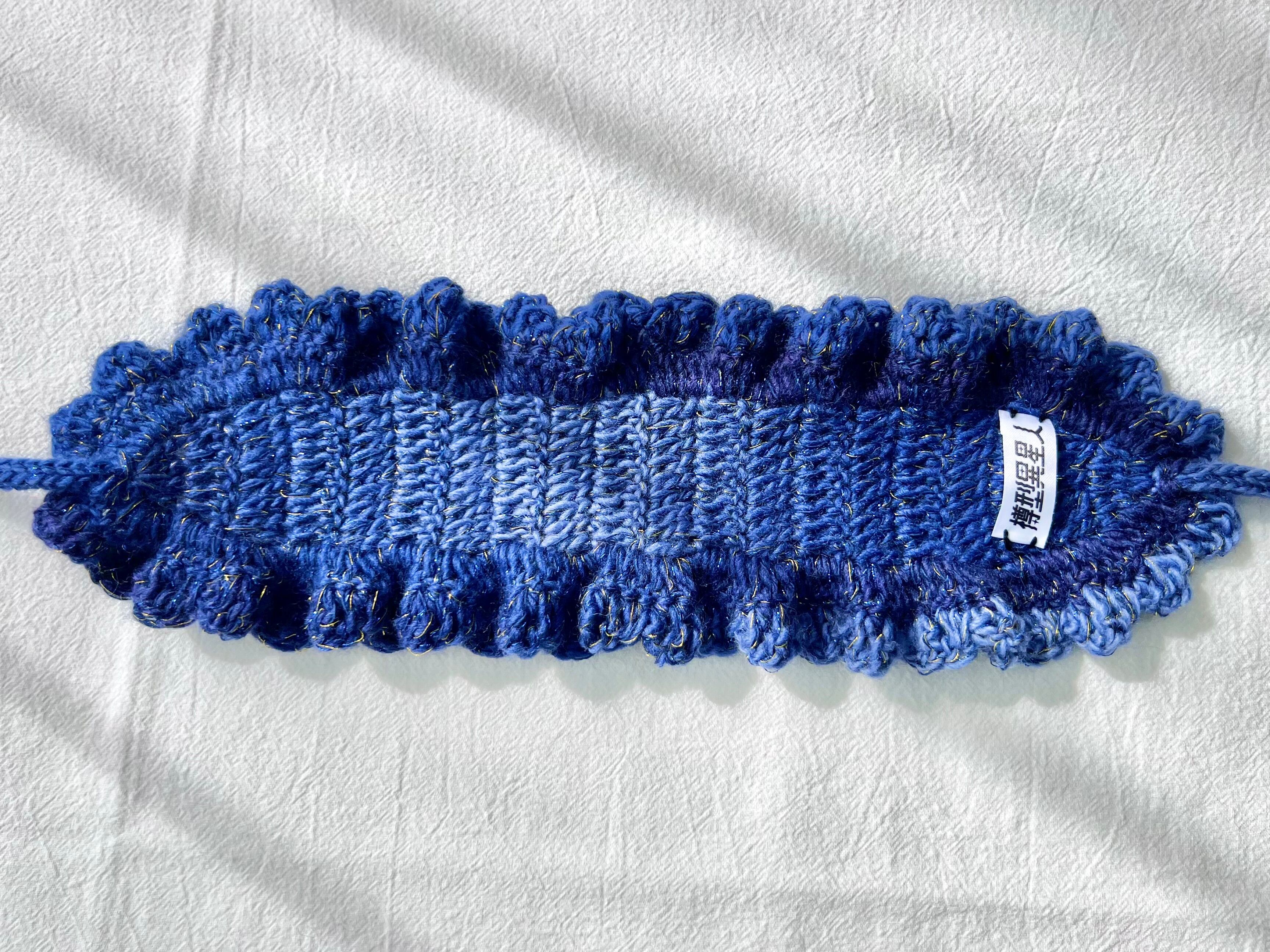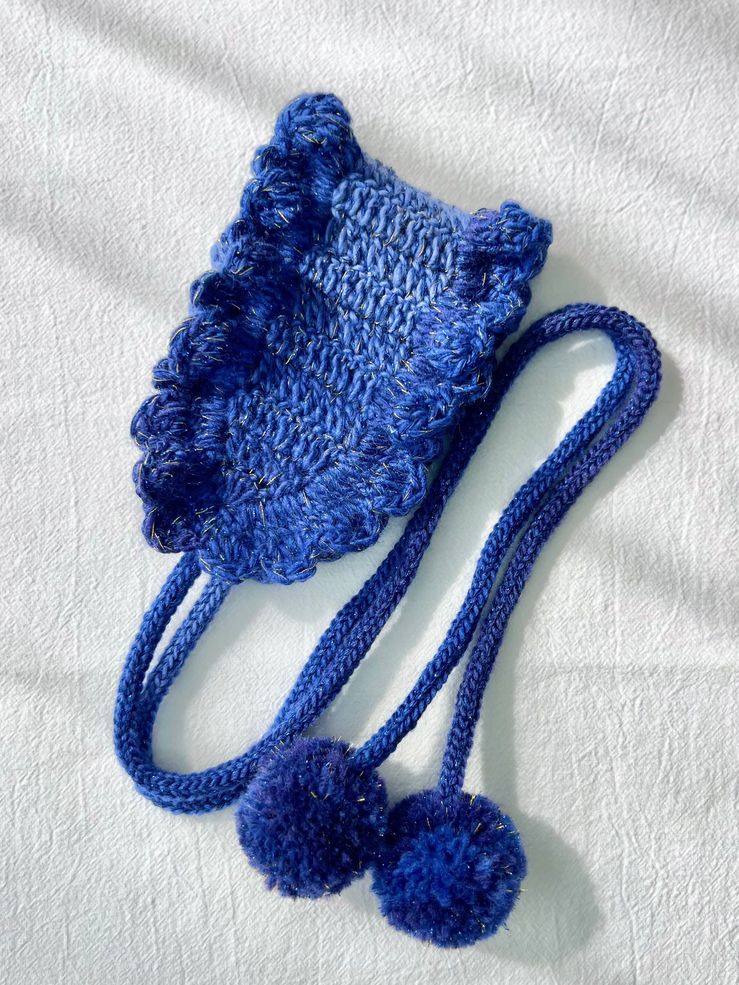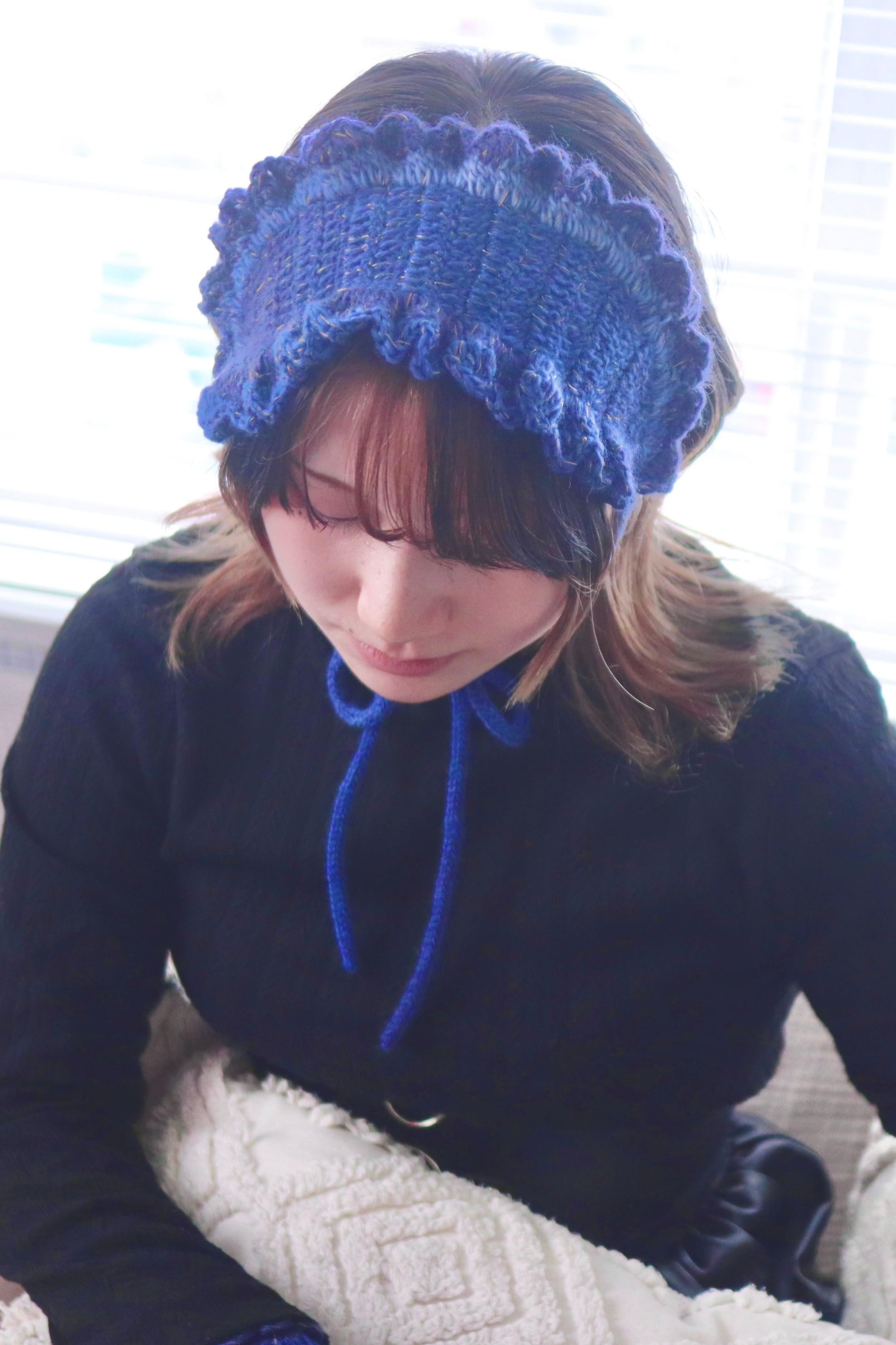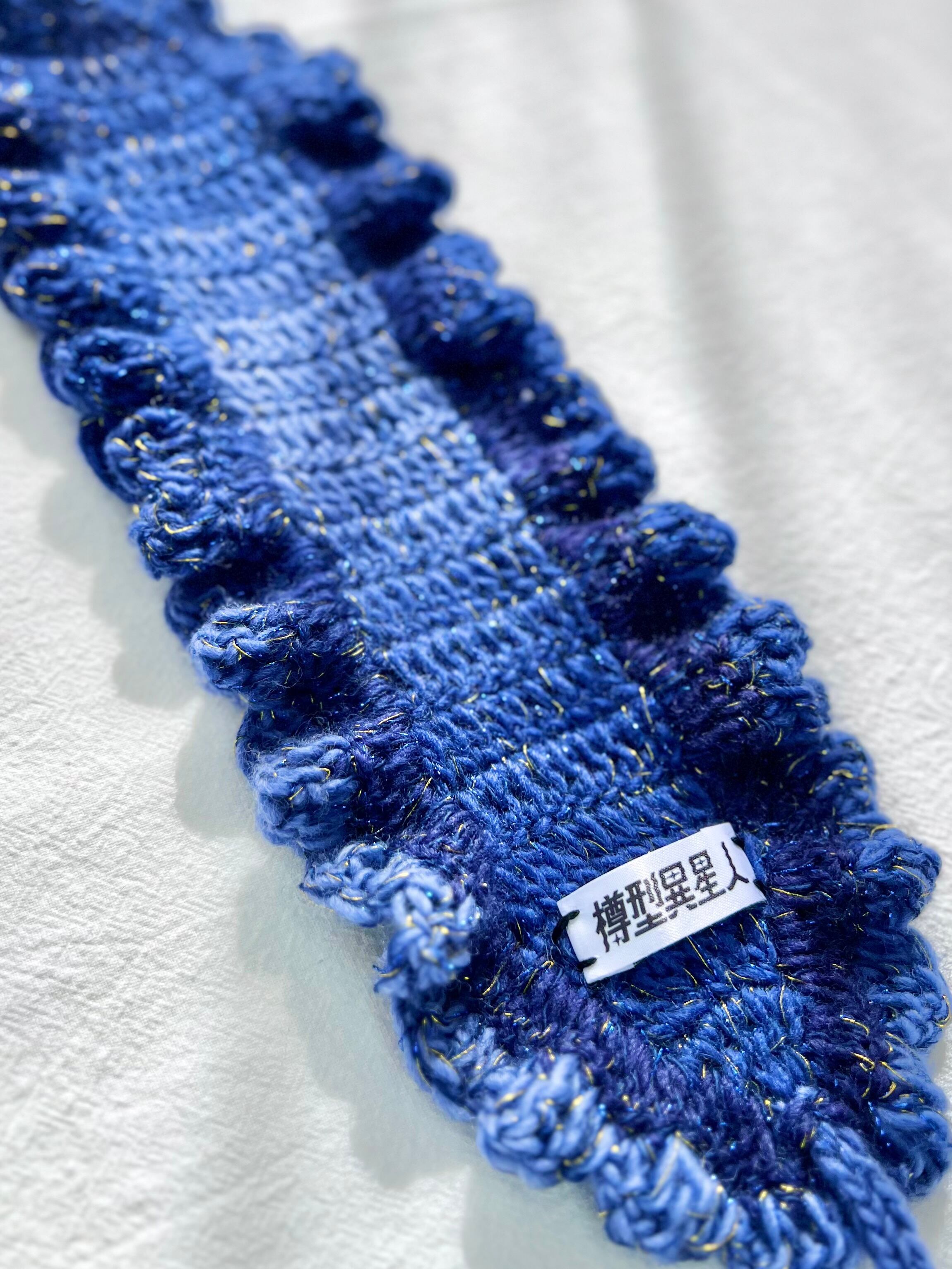 妖精コウモリの体と同じ、淡いネイビーのグラデーション毛糸に青いラメ糸と体毛と同じゴールドのラメ糸を引き揃えて編んだ、まるで妖精コウモリの羽そのもののような幻想的なヘッドドレスです。妖精コウモリの羽のようなギザギザのフリルが特徴的です˖ ࣪⊹