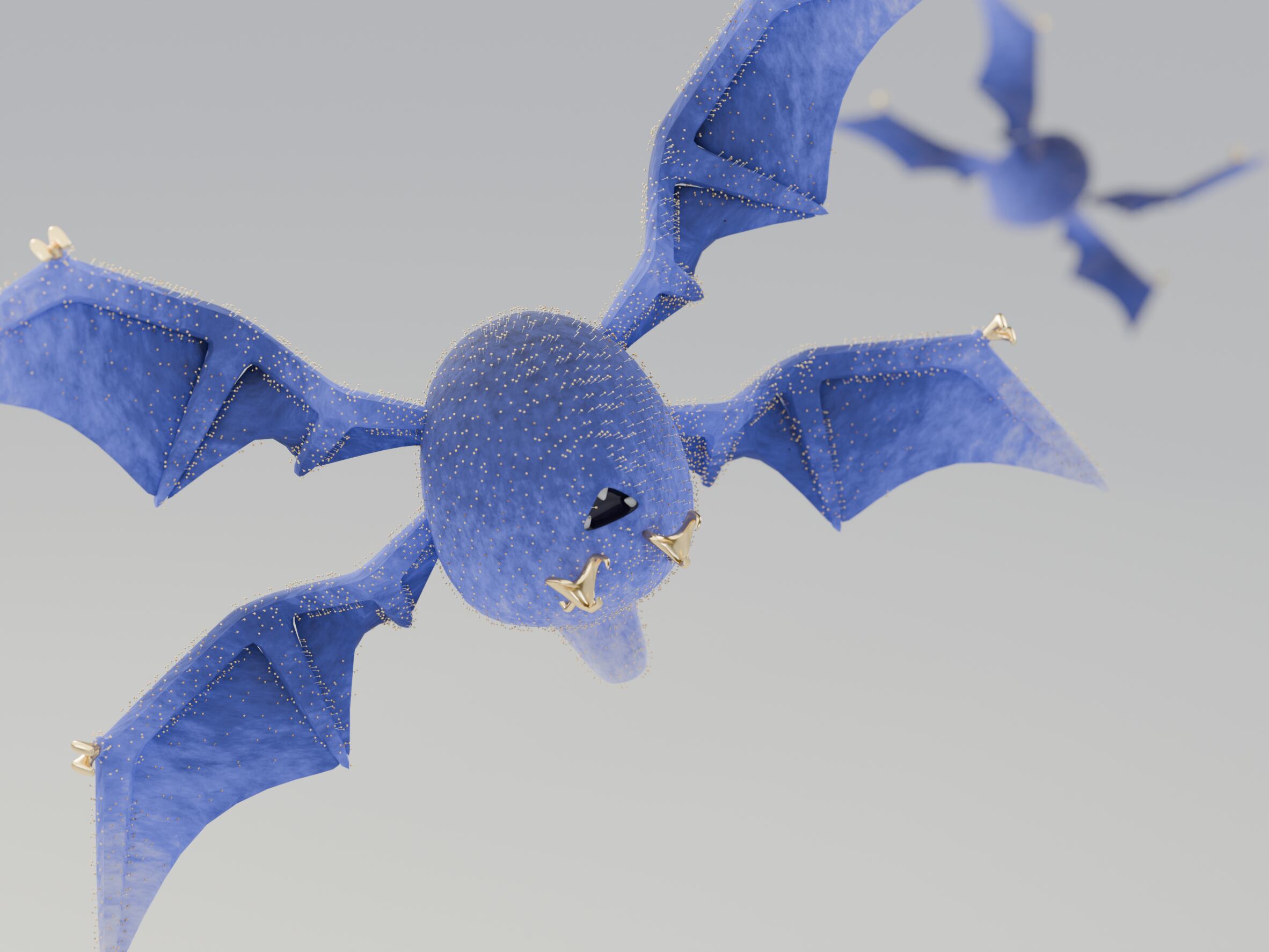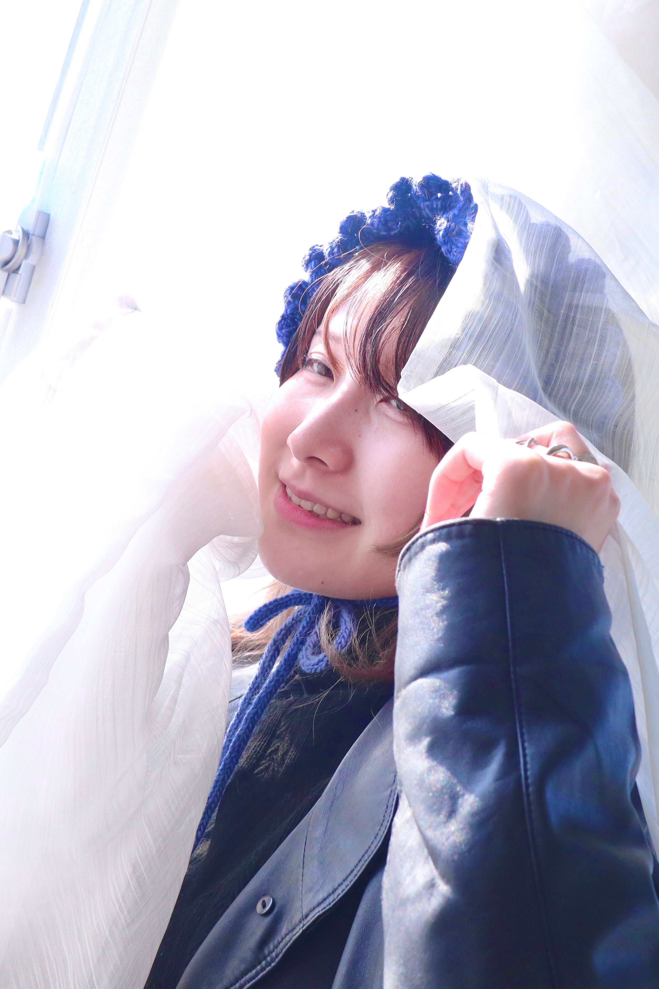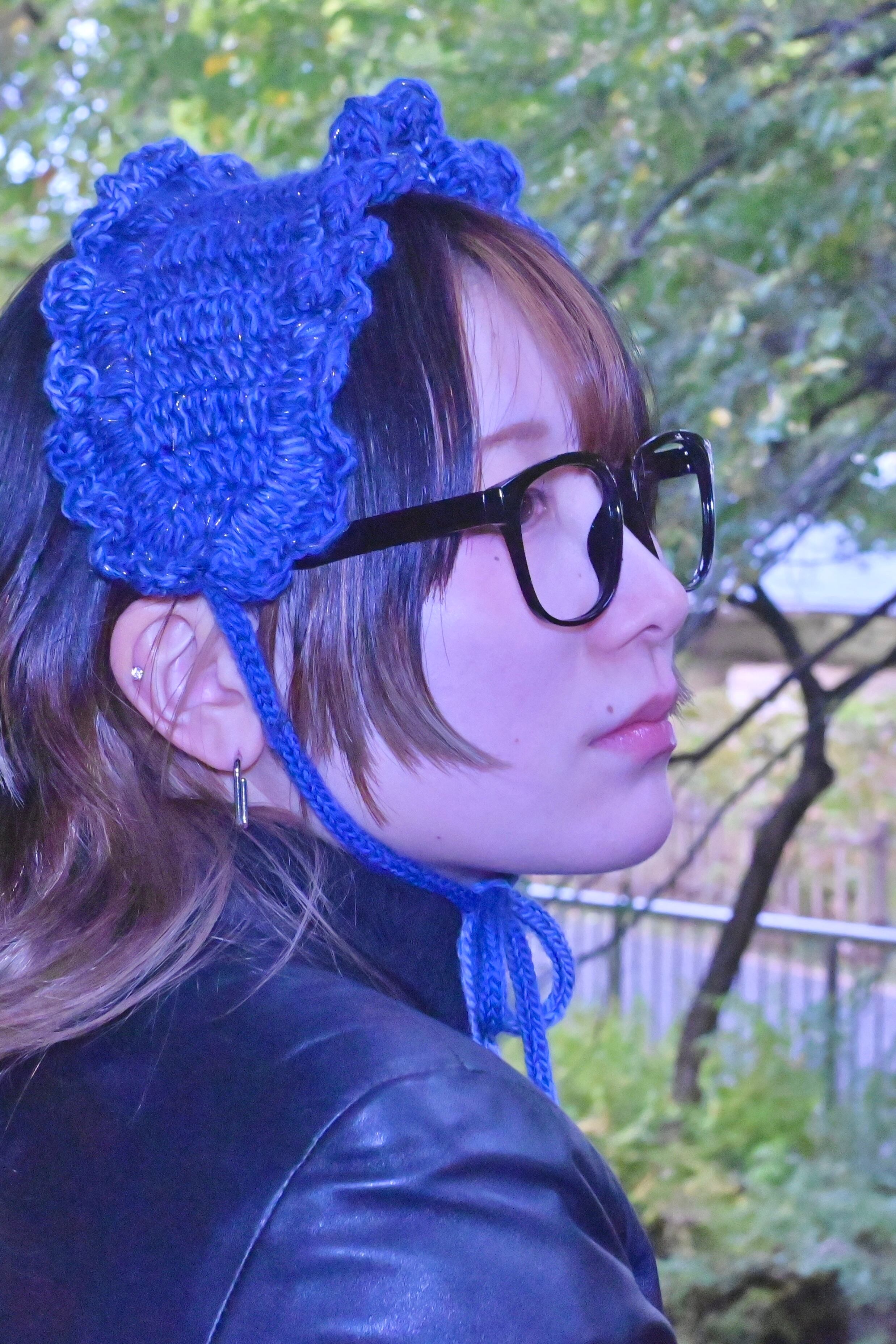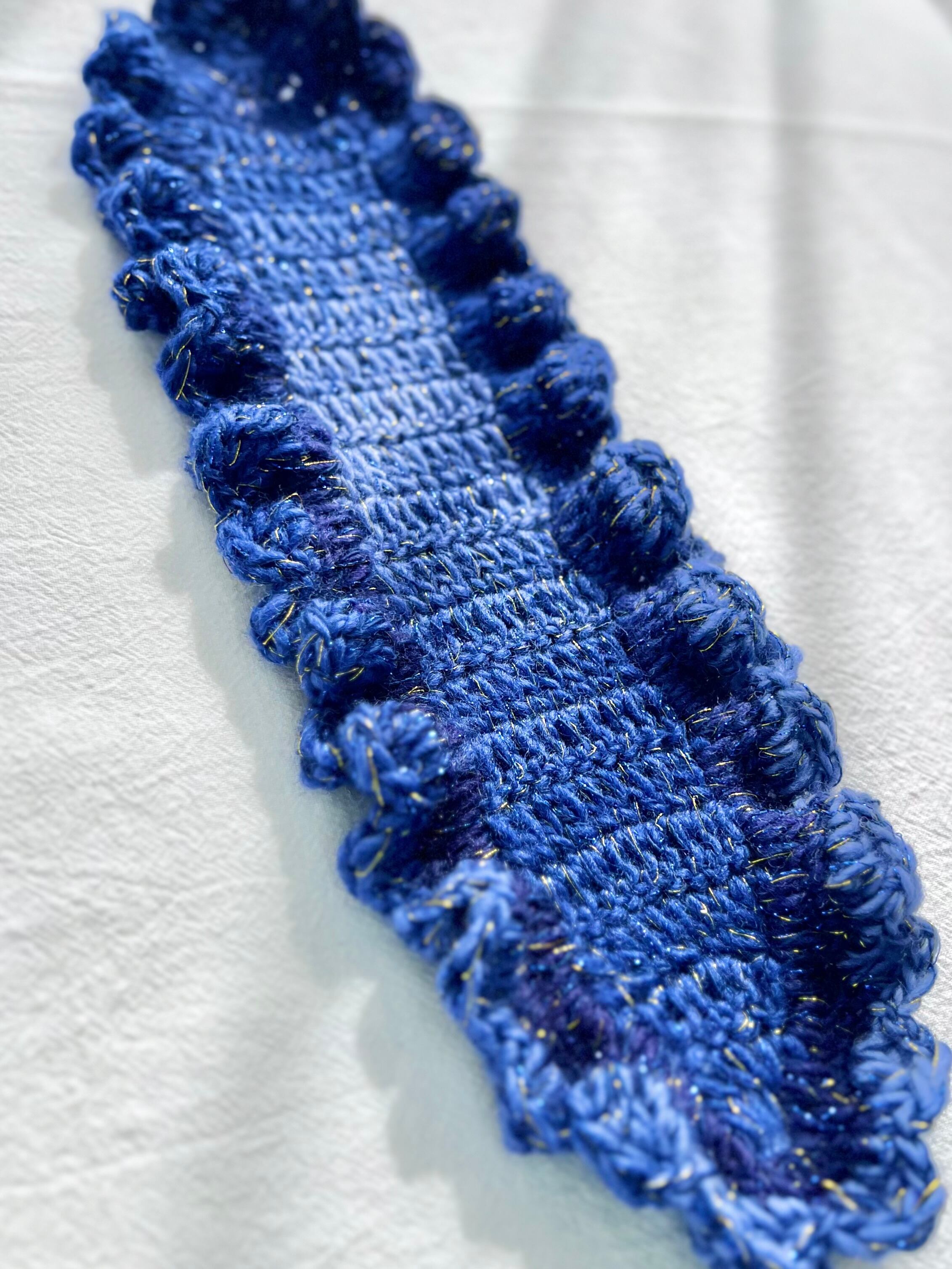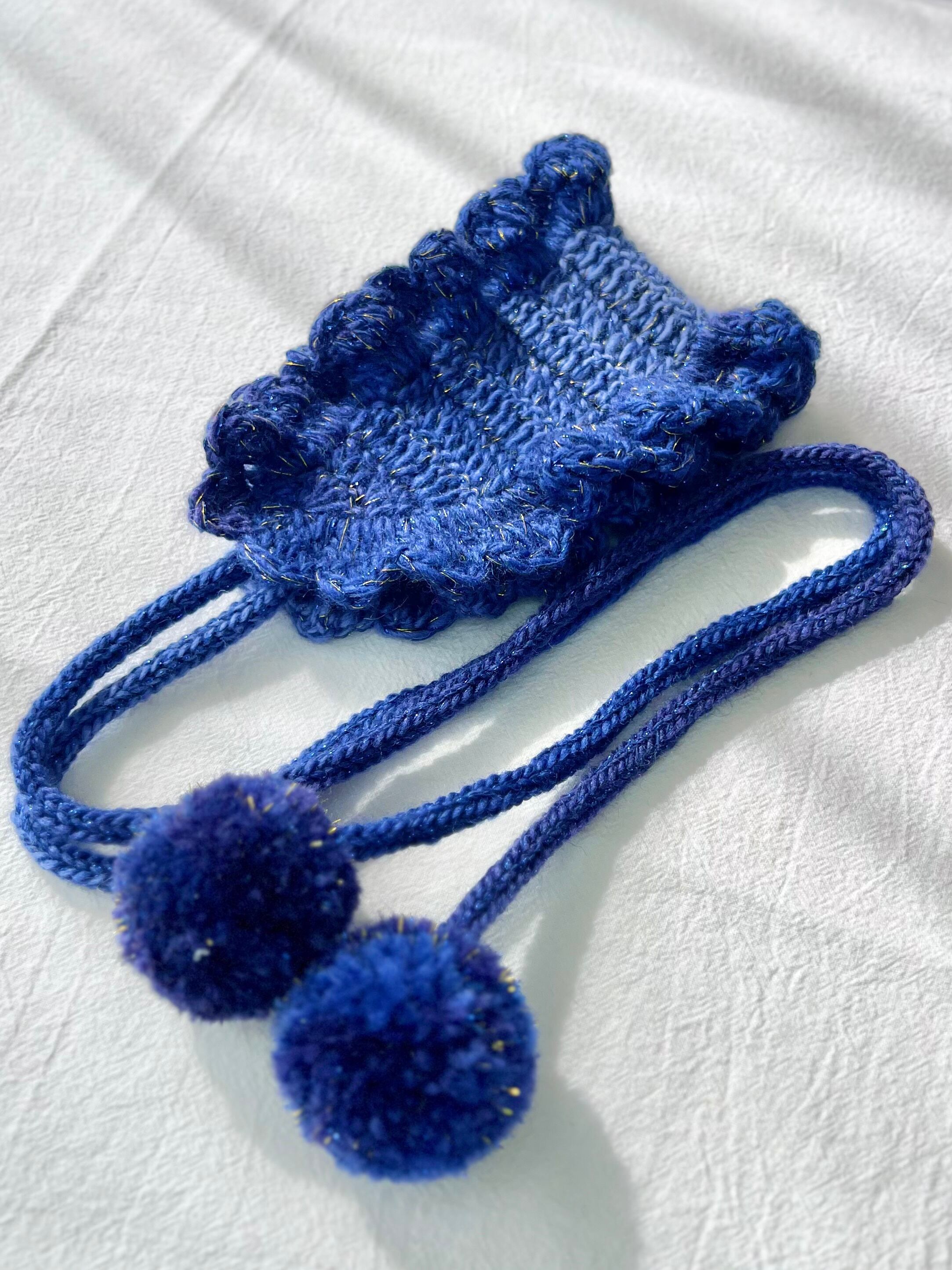 妖精コウモリの体と同じ、淡いネイビーのグラデーション毛糸に青いラメ糸と体毛と同じゴールドのラメ糸を引き揃えて編んだ、まるで妖精コウモリの羽そのもののような幻想的なヘッドドレスです。妖精コウモリの羽のようなギザギザのフリルが特徴的です˖ ࣪⊹