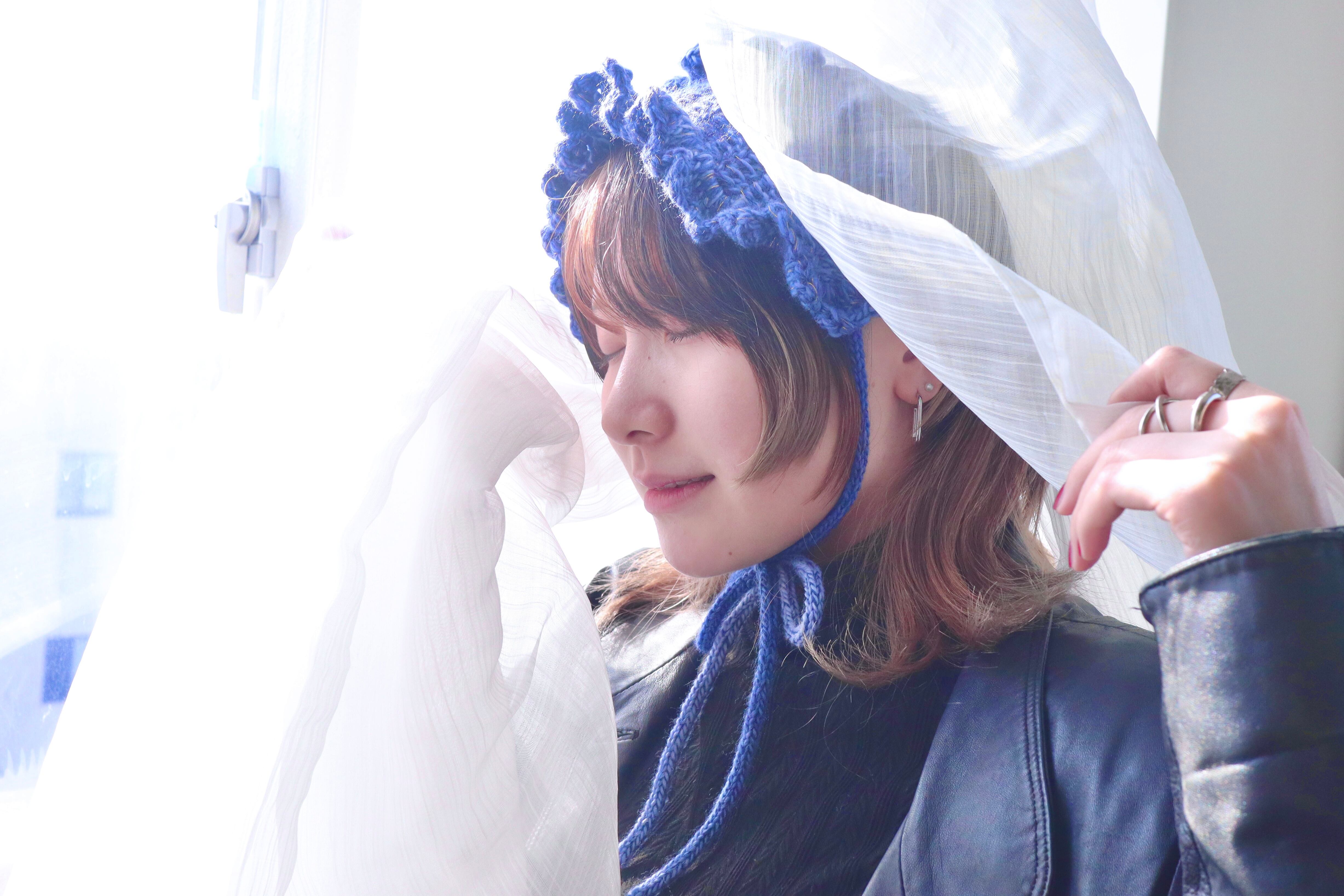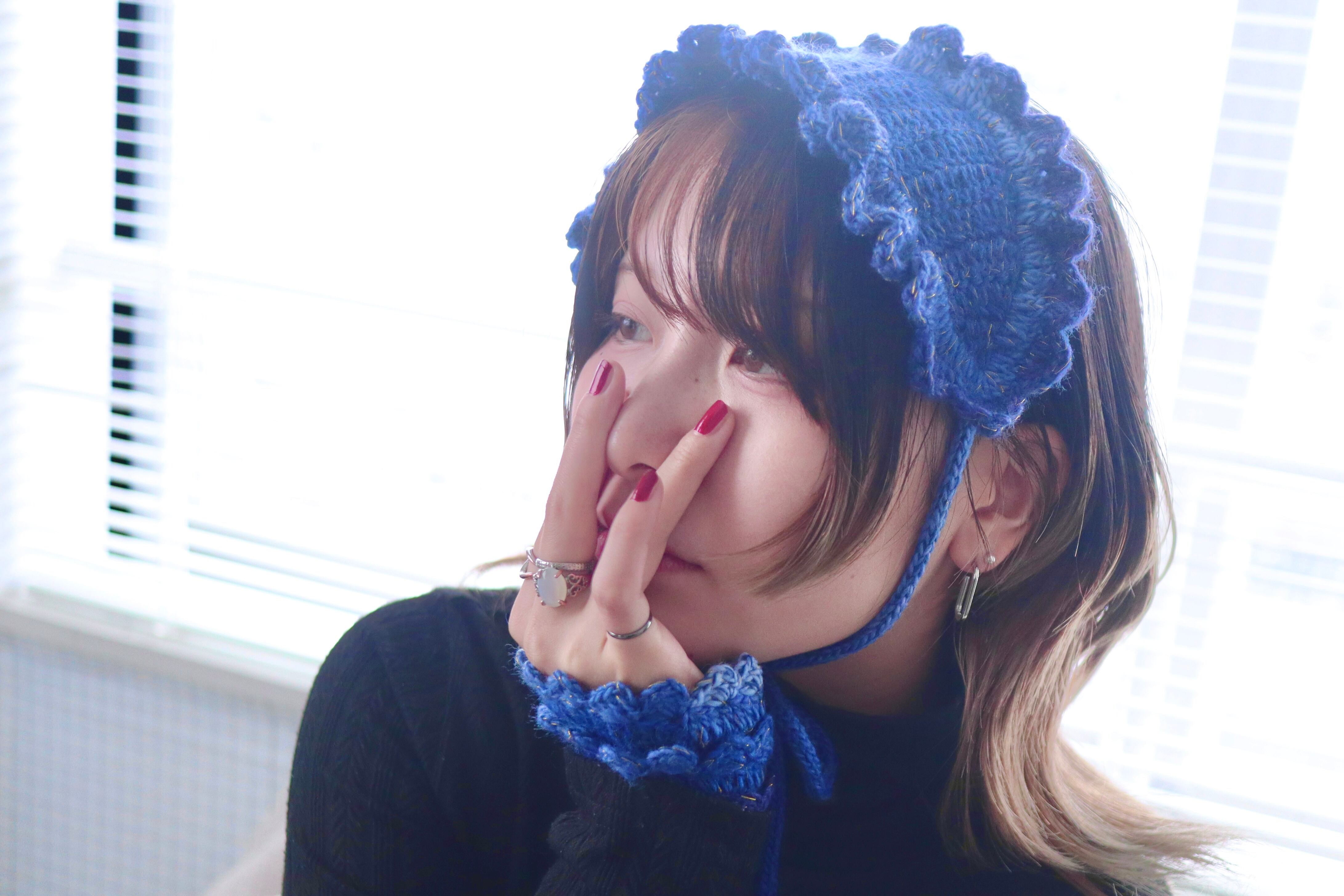 ※着用写真は青いラメ糸が編み込まれていない作品で撮影しています。