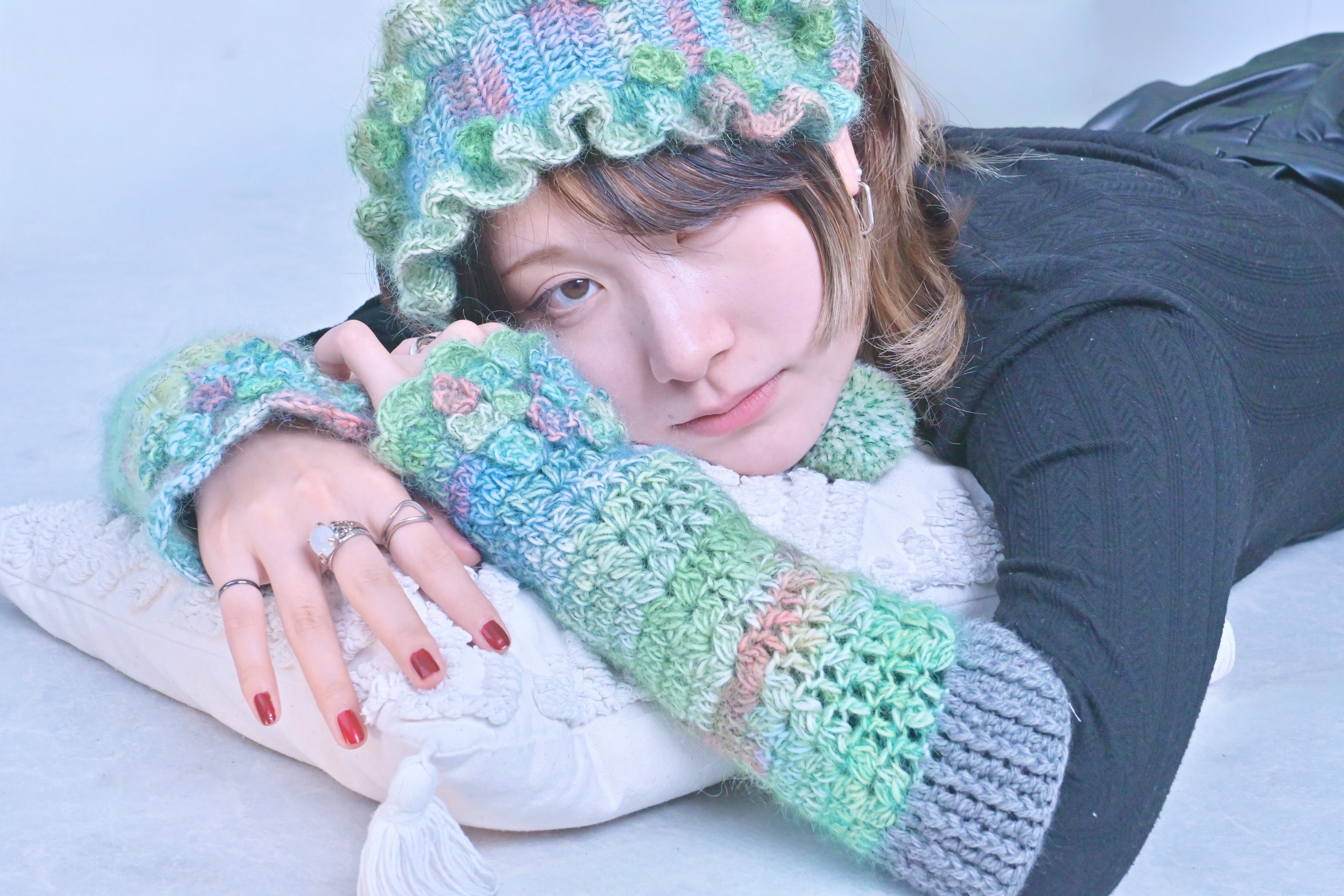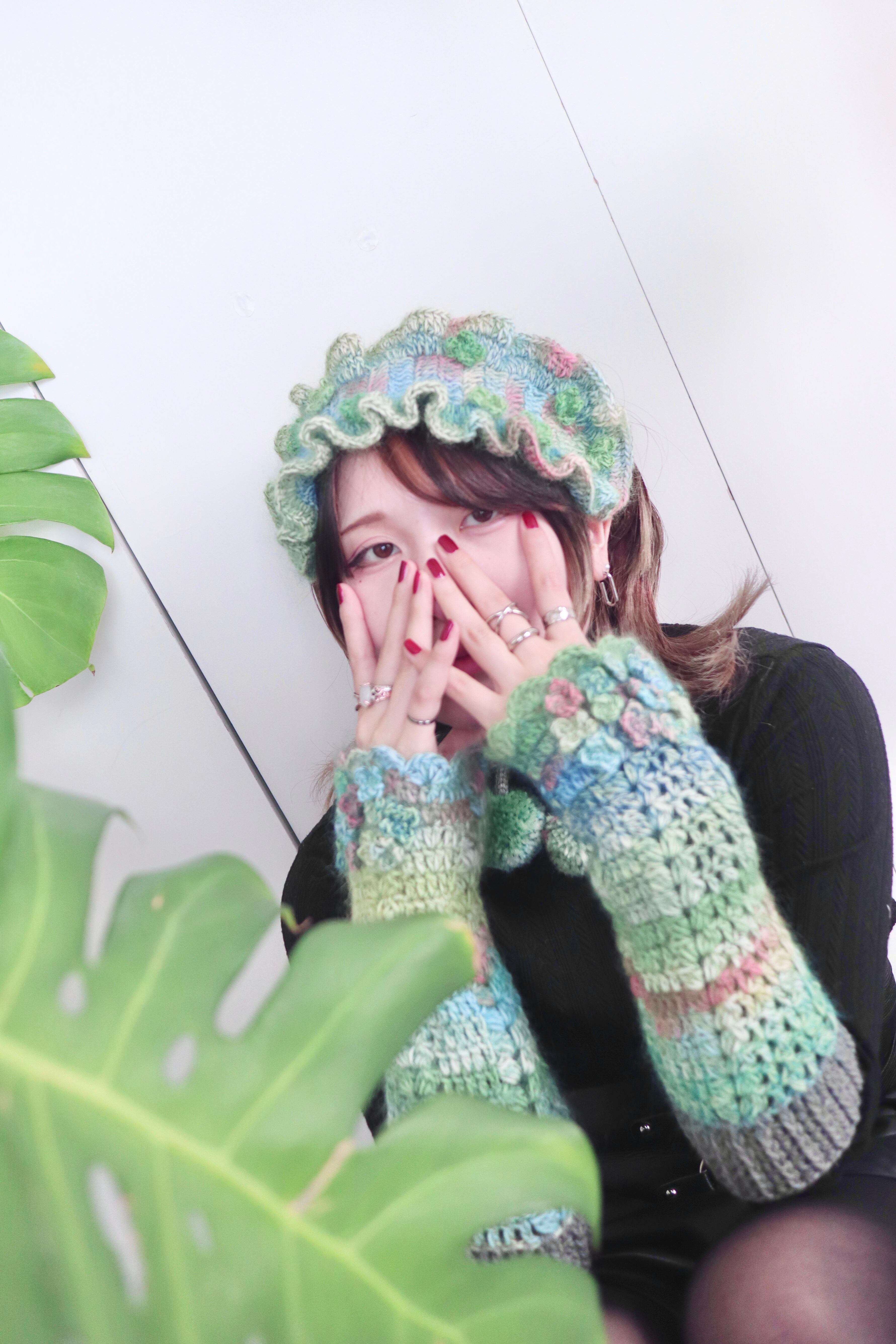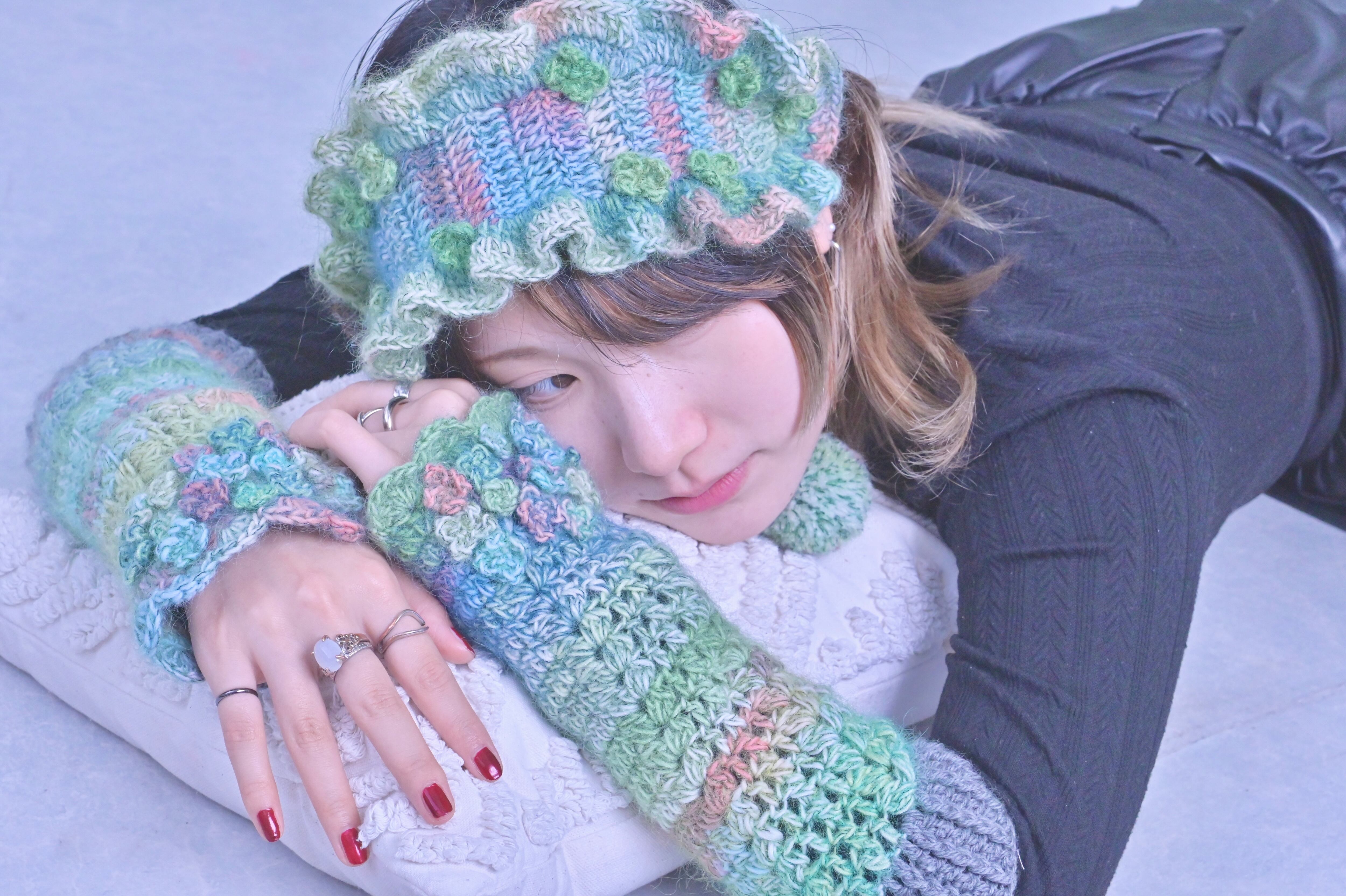 ムカデ石の頭に生えたふわふわの苔をイメージした作品です。使用した毛糸にはグリーンをメインにピンクやブルーなど様々な色がが混ざっており、ラメが入っている部分は光に当たると朝露のようにキラキラと光り神秘的です˖ ࣪⊹