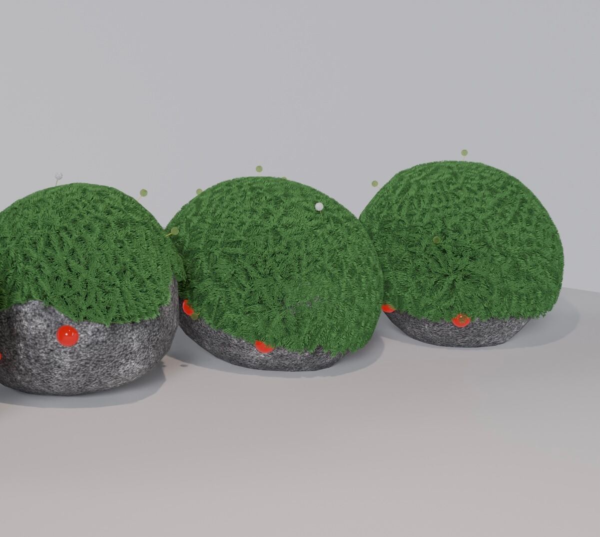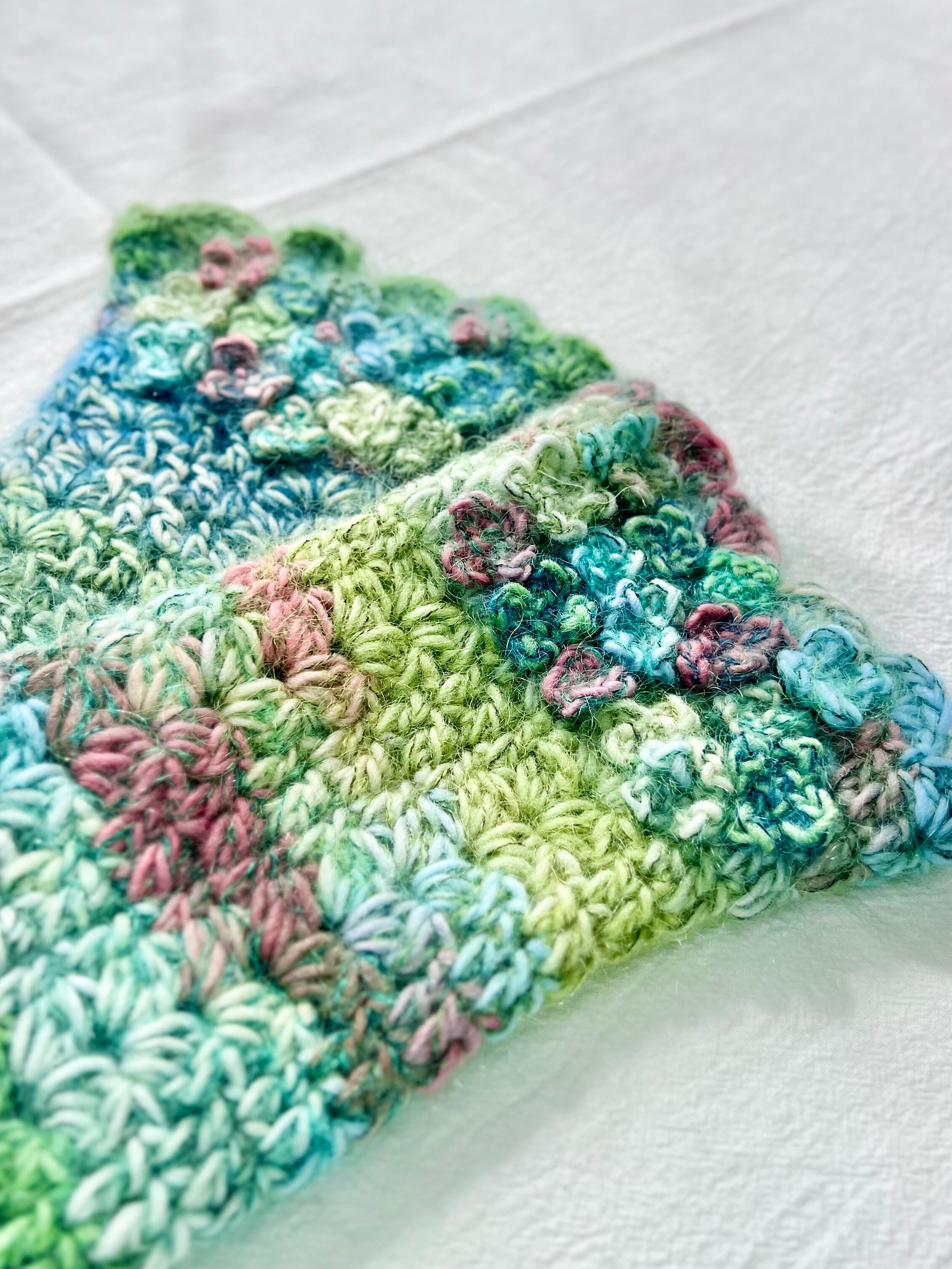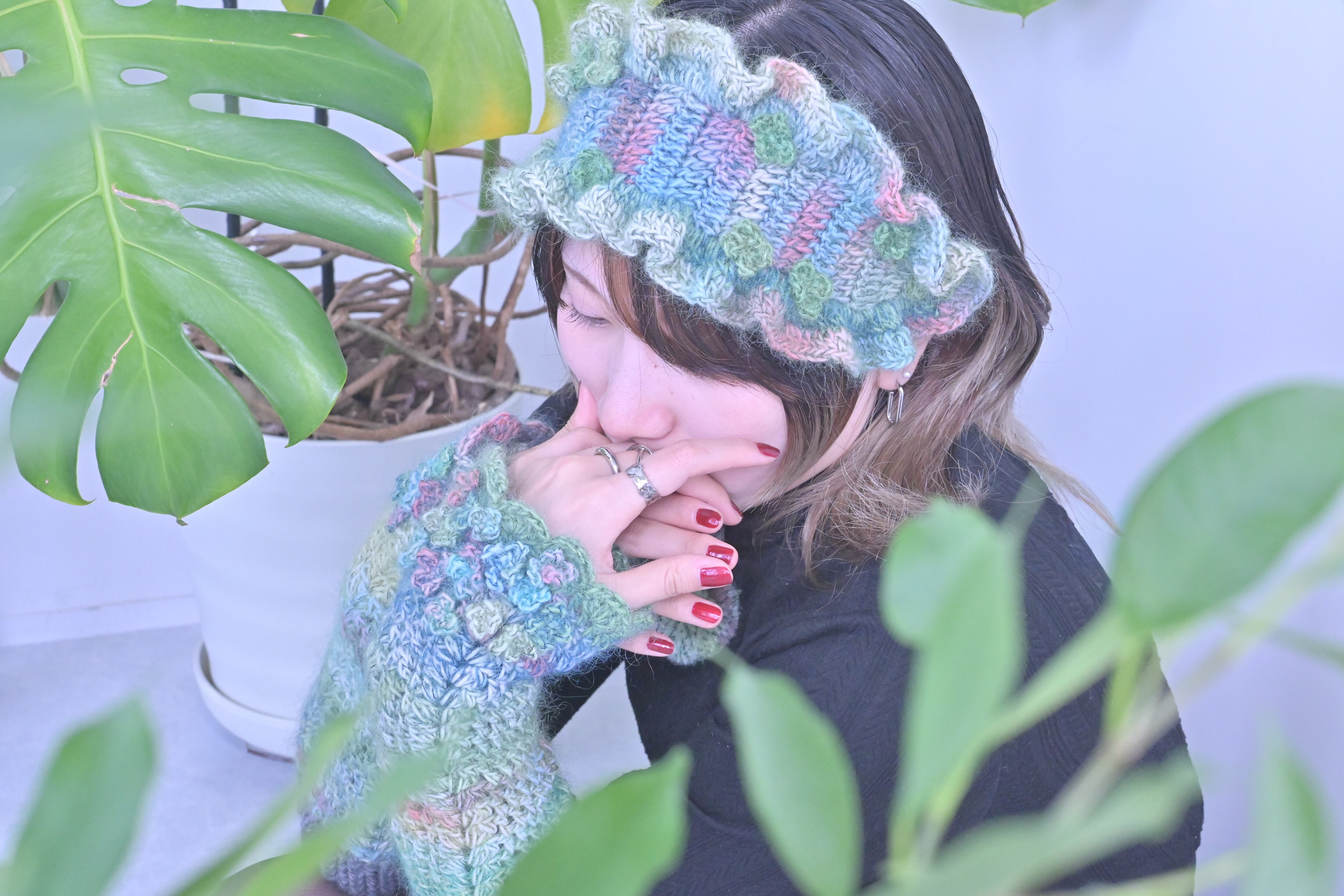 ムカデ石の頭に生えたふわふわの苔をイメージした作品です。使用した毛糸にはグリーンをメインにピンクやブルーなど様々な色がが混ざっており、ラメが入っている部分は光に当たると朝露のようにキラキラと光り神秘的です˖ ࣪⊹
